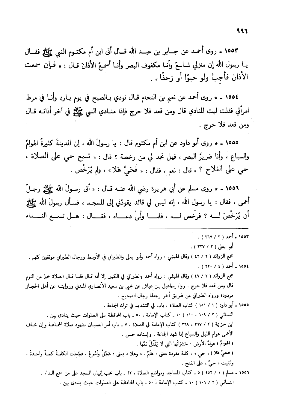 1553 - * روى أحمد عن جابر بن عبد الله قال أتى ابن أم مكتوم النبي صلى الله عليه وسلم فقال يا رسول الله إن منزلي شاسع وأنا مكفوف البصر وأنا أسمع الأذان قال: "فإن سمعت الأذان فأجب ولو حبواً أو زحفاً".