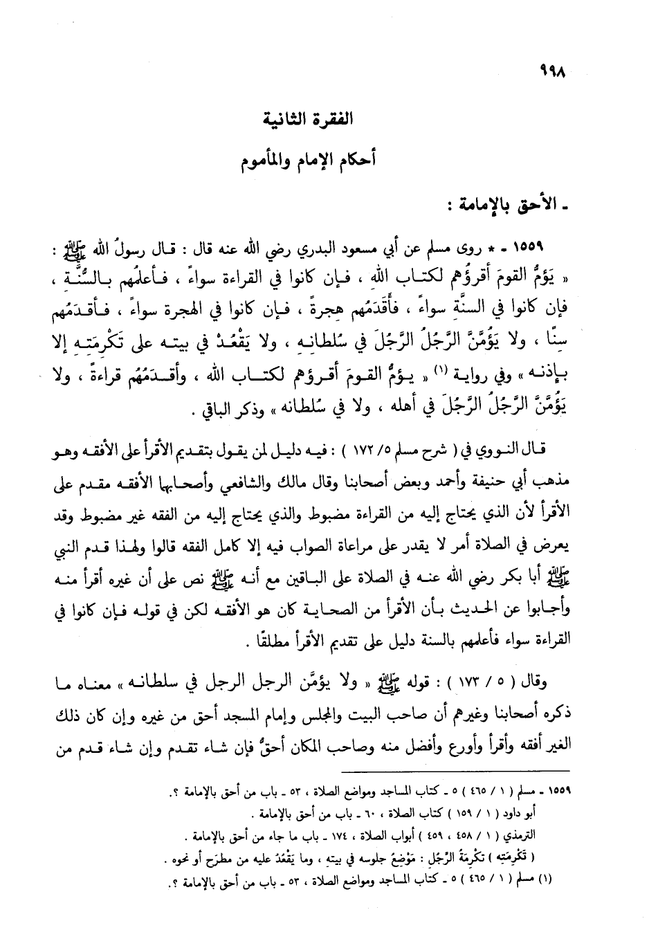 1559 - * روى مسلم عن أبي مسعود البدري رضي الله عنه قال: قال رسول الله صلى الله عليه وسلم: "يؤم القوم أقرؤهم لكتاب الله، فإن كانوا في القراءة سواء، فأعلمهم بالسنة، فإن كانوا في السنة سواء، فأقدمهم هجرة، فإن كانوا في الهجرة سواء، فأقدمهم سناً، ولا يؤمن الرجل الرجل في سلطانه، ولا يقعد في بيته على تكرمته إلا بإذنه" وفي رواية (2) "يؤم القوم أقرؤهم لكتاب الله، وأقدمهم قراءة، ولا يؤمن الرجل الرجل في أهله، ولا في سلطانه" وذكر الباقي.