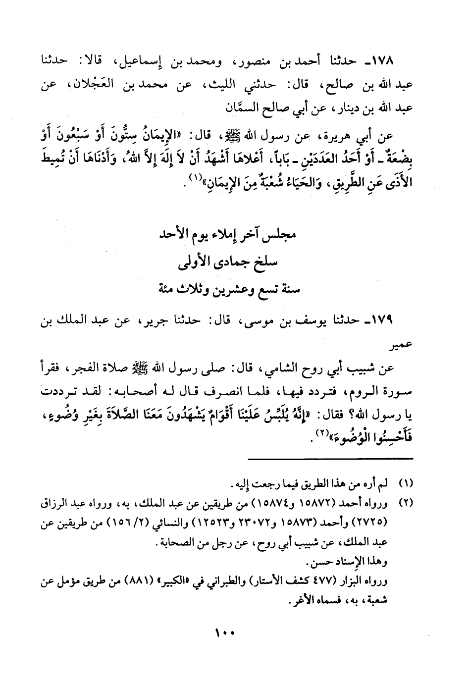 178 - حدثنا أحمد بن منصور ومحمد بن إسماعيل قالا حدثنا عَبْدُ اللَّهِ بْنُ صَالِحٍ قَالَ: حَدَّثَنِي اللَّيْثُ عن محمد بن العجلان عن عبد الله بن دينار عَنْ أَبِي صَالِحٍ السَّمَّانِ عَنْ أَبِي هُرَيْرَةَ عَنْ رَسُولِ اللَّهِ صَلَّى اللَّهُ عَلَيْهِ وَسَلَّمَ قال الإيمان ستون أو سبعون أو بضعة أو أحد العددين بابا أعلاها أشهد أن لا إله إلا الله وأدناها أن تميط الأذى عن الطريق والحياء شعبة من الإيمان.