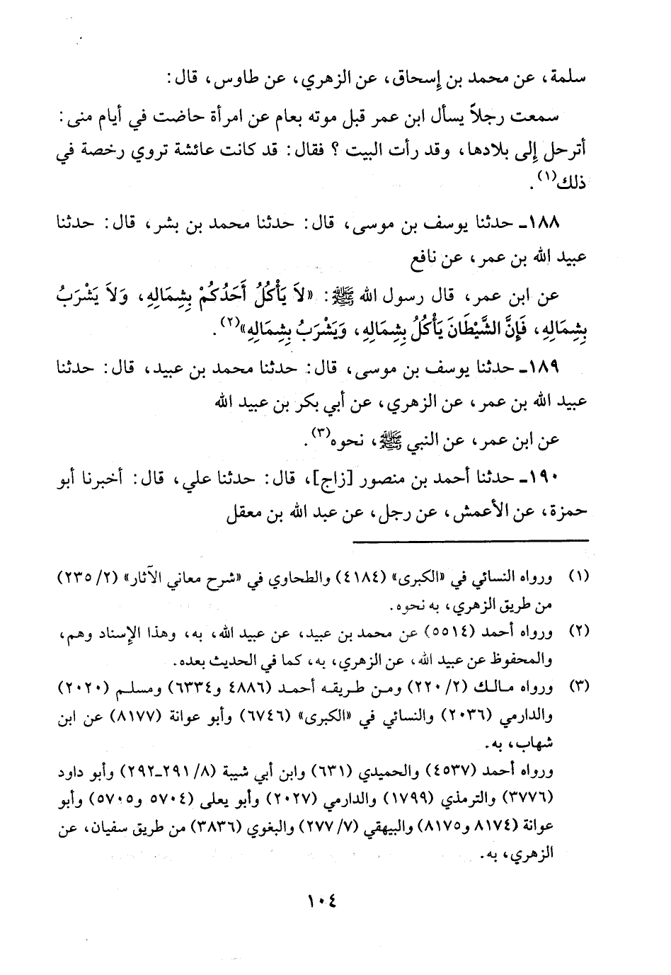 188 - حدثنا يوسف بن موسى قال: حدثنا محمد بن بشر قال: حدثنا عُبَيْدِ اللَّهِ بْنِ عُمَرَ عَنْ نَافِعٍ عَنِ ابن عمر قَالَ رَسُولُ اللَّهِ صَلَّى اللَّهُ عَلَيْهِ وَسَلَّمَ لا يأكل أحدكم بشماله ولا يشرب بشماله فإن الشيطان يأكل بشماله ويشرب بشماله.