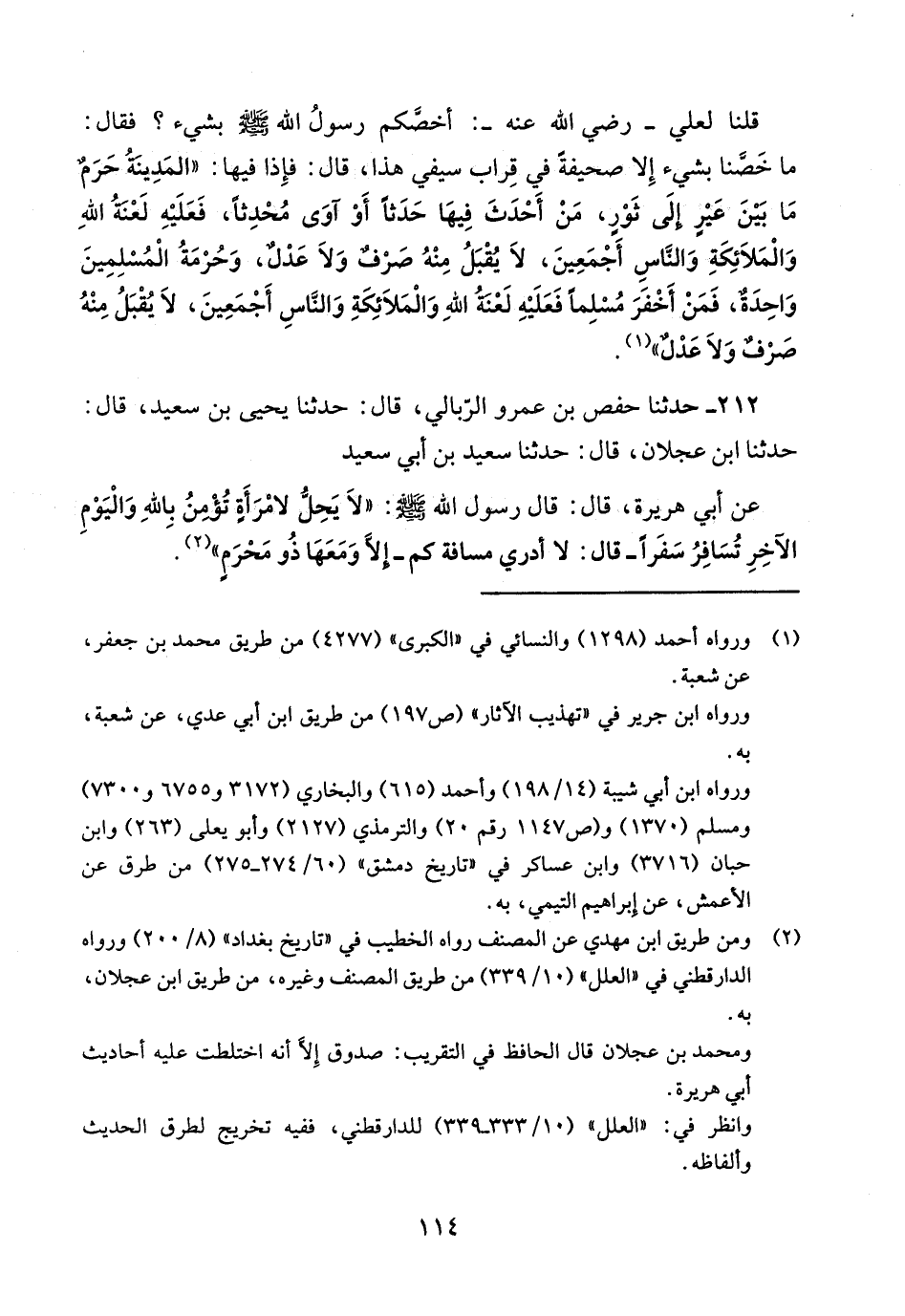 212 - حدثنا حفص بن عمرو الربالي قال: حدثنا يحيى بن سعيد قال: حدثنا ابن عجلان قال: حدثنا سعيد بن أبي سعيد عَنْ أَبِي هُرَيْرَةَ قَالَ: قَالَ رَسُولُ اللَّهِ صلى الله عليه وسلم لا يحل لامرأة تؤمن بالله واليوم الآخر تسافر سفرا قال لا أدري مسافة كم إلا ومعها ذو محرم.
