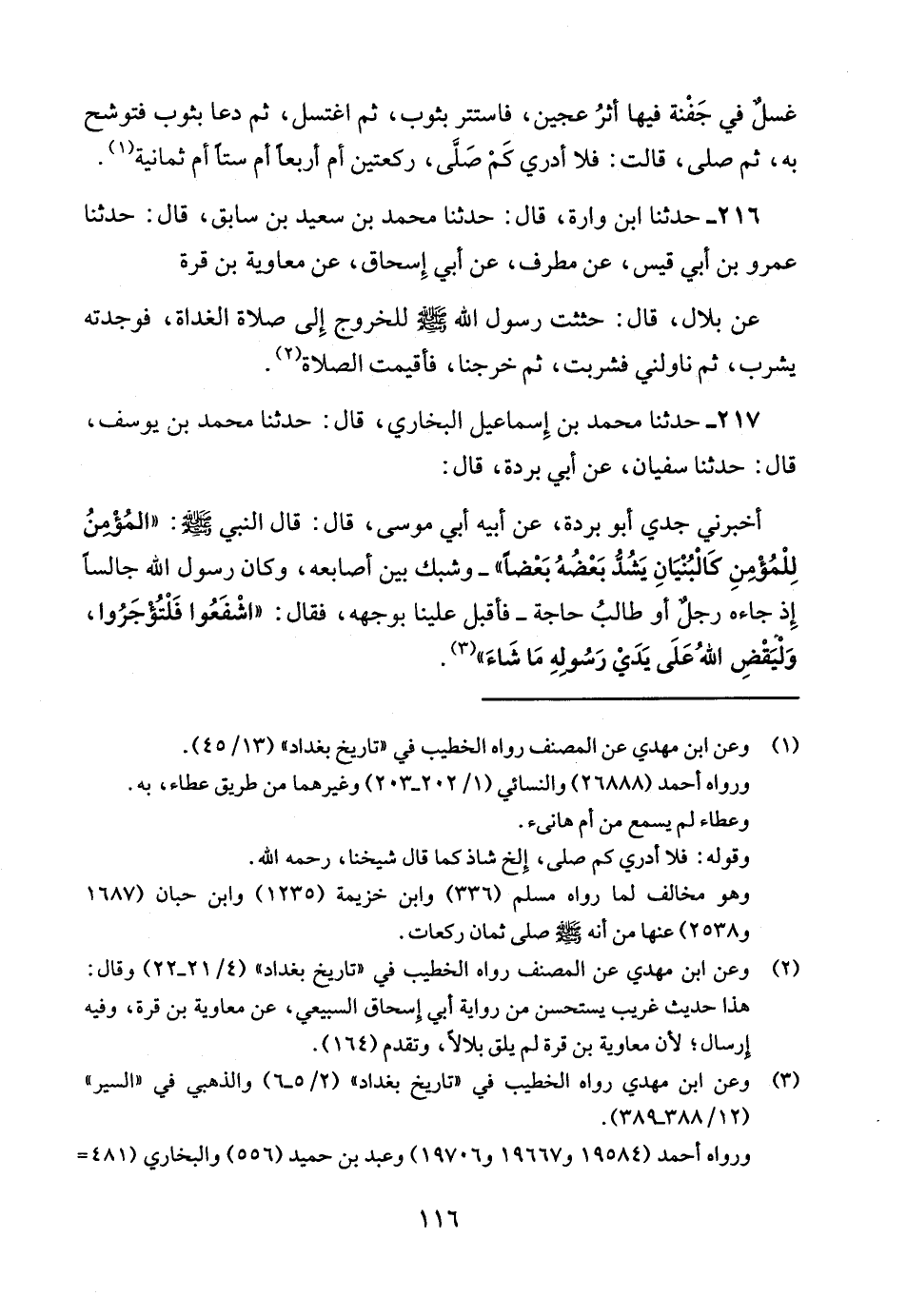 216 - حدثنا ابن وارة قال: حدثنا محمد بن سعيد بن سابق قال: حدثنا عمرو بن أبي قيس عن مطرف عن أبي إسحاق عن معاوية بن قرة عن بلال قال حثثت رسول الله صلى الله عليه وسلم للخروج إلى صلاة الغداة فوجدته يشرب ثم ناولني فشربت ثم خرجنا فأقيمت الصلاة.