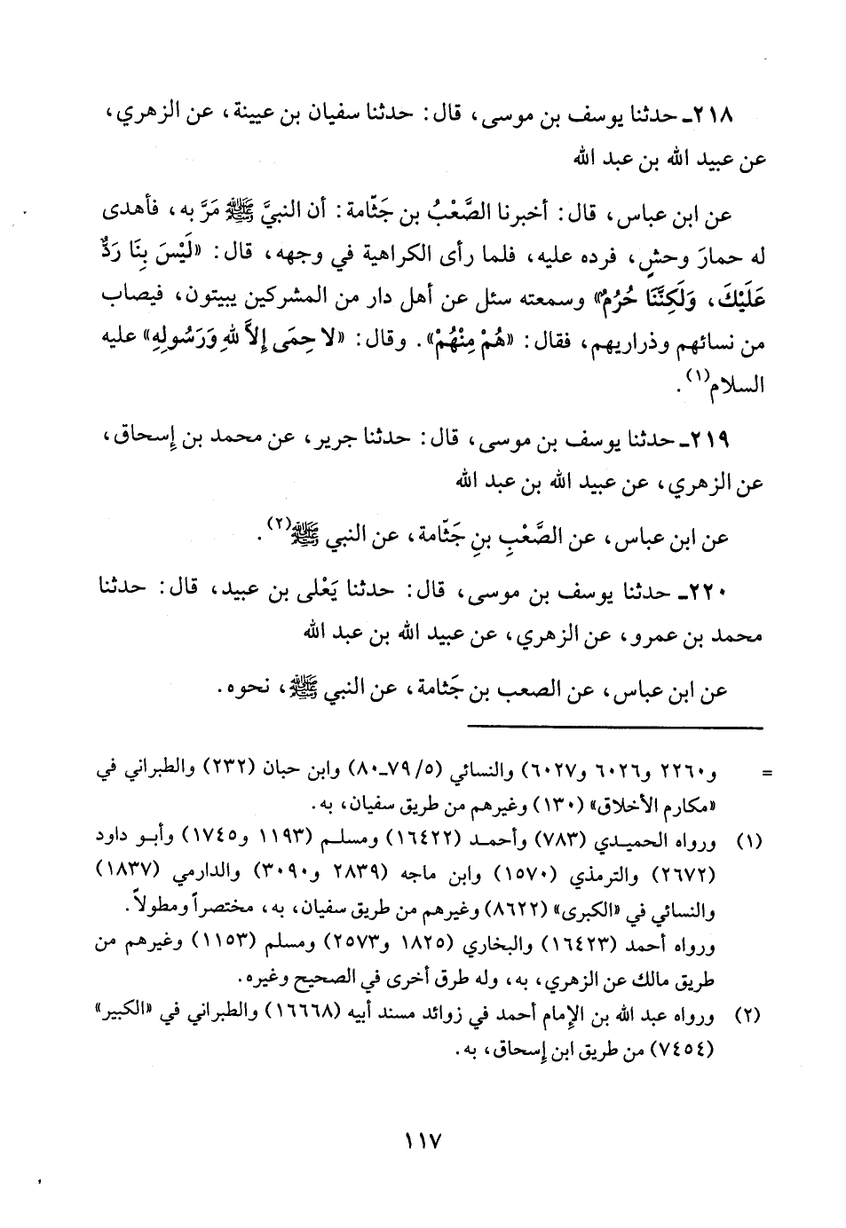 219 - حدثنا يوسف بن موسى قال: حدثنا جرير عن محمد بن إسحاق عن الزهري عن عبيد الله بن عبد الله عن ابن عباس عن الصعب بن جثامة عن النبي صَلَّى اللَّهُ عَلَيْهِ وَسَلَّمَ.