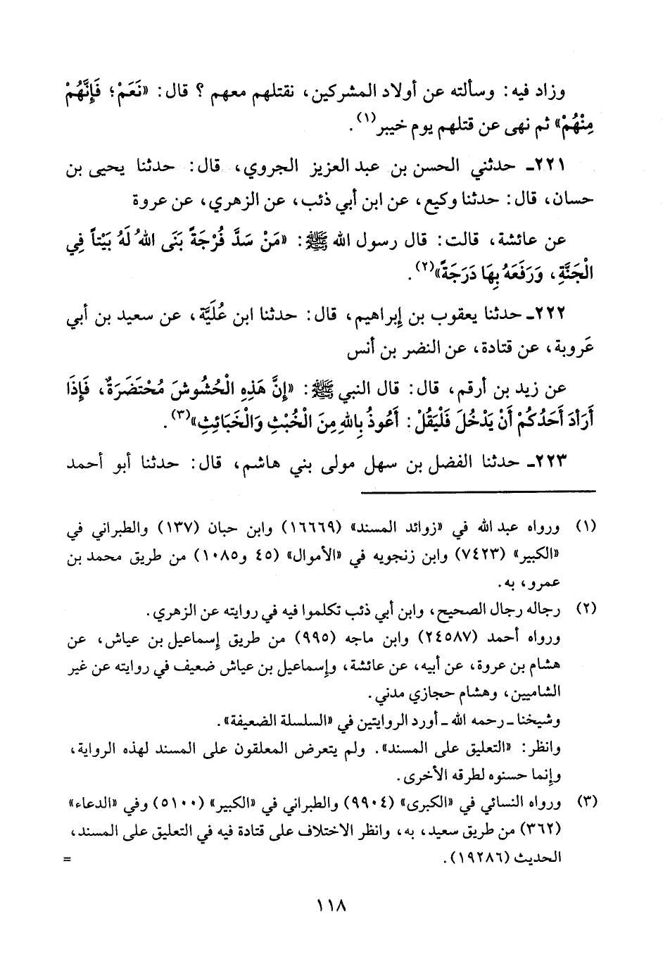 222 - حدثنا يعقوب بن إبراهيم قال حدثنا ابن علية عن سعيد بن أبي عروبة عن قتادة عن النضر بن أنس عن زيد بن أرقم قَالَ قَالَ النَّبِيُّ صَلَّى اللَّهُ عَلَيْهِ وَسَلَّمَ إن هذه الحشوش محتضرة فإذا أراد أحدكم أن يدخل فليقل أعوذ بالله من الخبث والخبائث.