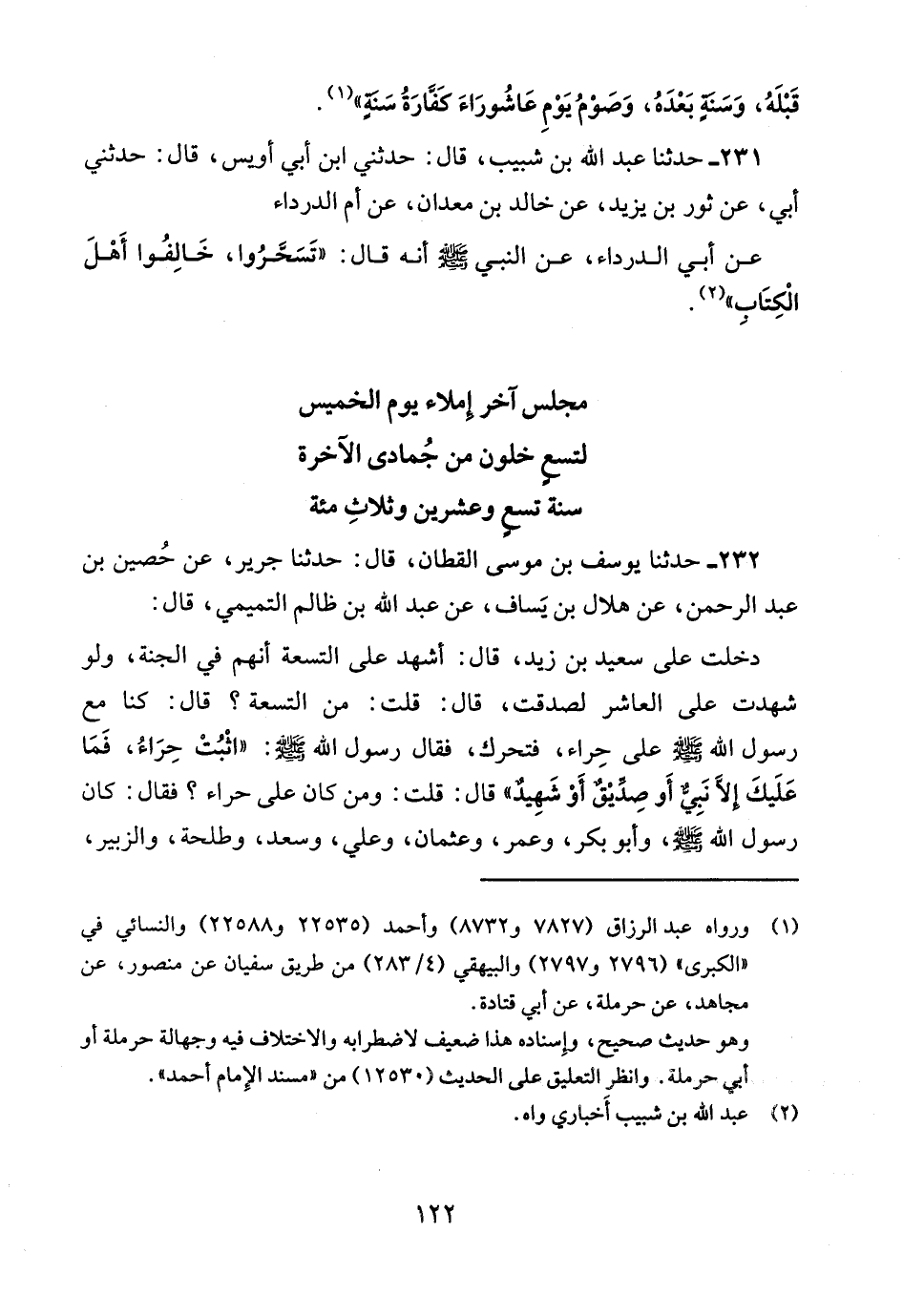 232 - حدثنا يوسف بن موسى القطان قال: حدثنا جرير عن حصين بن عبد الرحمن عن هلال بن يساف عن عبد الله بن ظالم التميمي قال دخلت على سعيد بن زيد قال أشهد على التسعة أنهم في الجنة ولو شهدت على العاشر لصدقت قال قلت من التسعة؟ قَالَ كُنَّا مَعَ رَسُولِ اللَّهِ صَلَّى اللَّهُ عَلَيْهِ وَسَلَّمَ على حراء فتحرك فَقَالَ رَسُولُ اللَّهِ صَلَّى اللَّهُ عَلَيْهِ وَسَلَّمَ اثبت حراء فما عليك إلا نبي أو صديق أو شهيد قال قلت ومن كان على حراء؟ فقال كَانَ رَسُولُ اللَّهِ صَلَّى اللَّهُ عَلَيْهِ وَسَلَّمَ وأبو بكر وعمر وعثمان وعلي وسعد وطلحة والزبير -[123]- وعبد الرحمن بن عوف قال قلت من العاشر قال أنا.