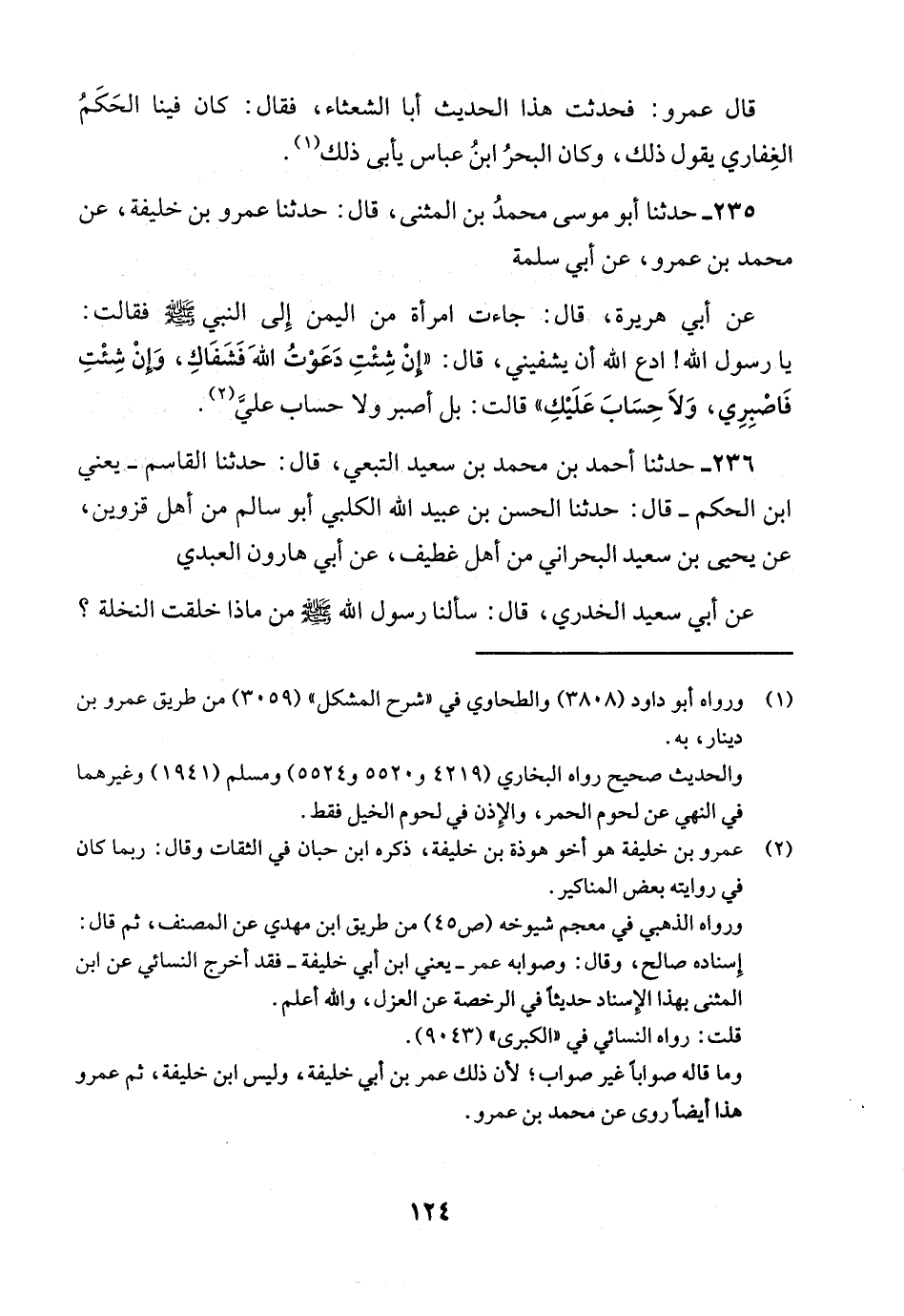 235 - حدثنا أبو موسى محمد بن المثنى قال حدثنا عمرو بن خليفة عن مُحَمَّدُ بْنُ عَمْرٍو عَنْ أَبِي سَلَمَةَ عَنْ أبي هريرة قال جاءت امرأة من اليمن إلى النبي صلى الله عليه وسلم فقالت يا رسول الله ادع الله أن يشفيني قال إن شئت دعوت الله فشفاك وإن شئت فاصبري ولا حساب عليك قالت: بل أصبر ولا حساب علي.