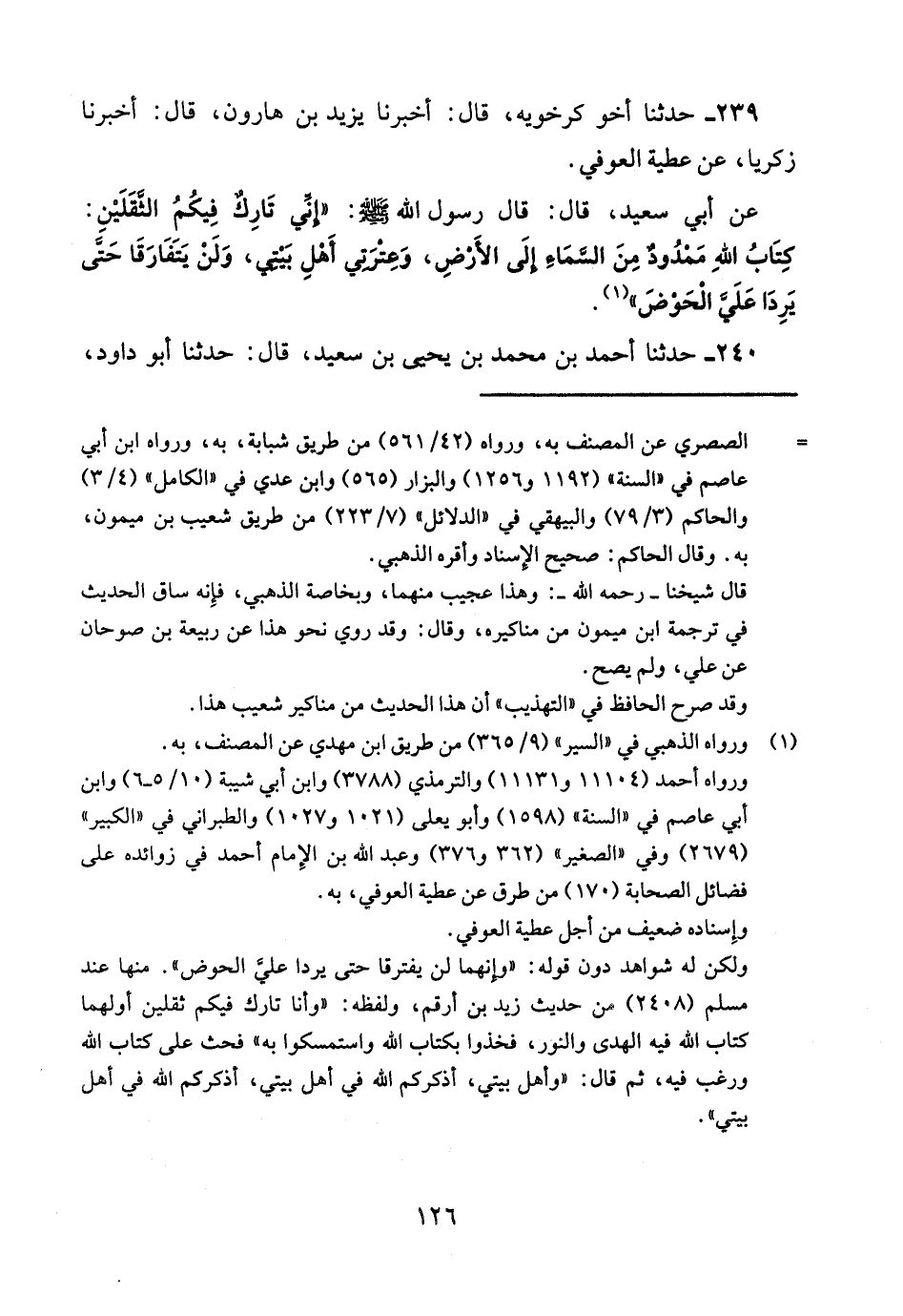 239 - حدثنا أخو كرخويه قال: أخبرنا يزيد بن هارون قال: أخبرنا زكريا عن عطية العوفي عَنْ أَبِي سَعِيدٍ قَالَ: قَالَ رَسُولُ اللَّهِ صَلَّى اللَّهُ عَلَيْهِ وسلم إني تارك فيكم الثقلين كتاب الله ممدود من السماء إلى الأرض وعترتي أهل بيتي ولن يتفارقا حتى يردا علي الحوض.