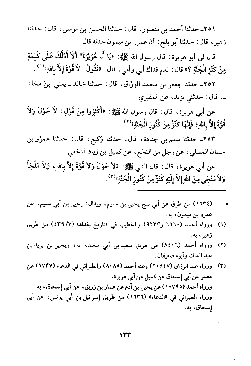 251 - حدثنا أحمد بن منصور قال: حدثنا الحسن بن موسى قال: حدثنا زهير قال: حدثنا أبو بلج أن عمرو بن ميمون حدثه قال قال لي أبو هريرة قَالَ رَسُولُ اللَّهِ صَلَّى اللَّهُ عَلَيْهِ وَسَلَّمَ يا أبا هريرة ألا أدلك على كلمة من كنز الجنة قال نعم فداك أبي وأمي قال تقول لا قُوَّةَ إِلاَّ بِاللهِ.