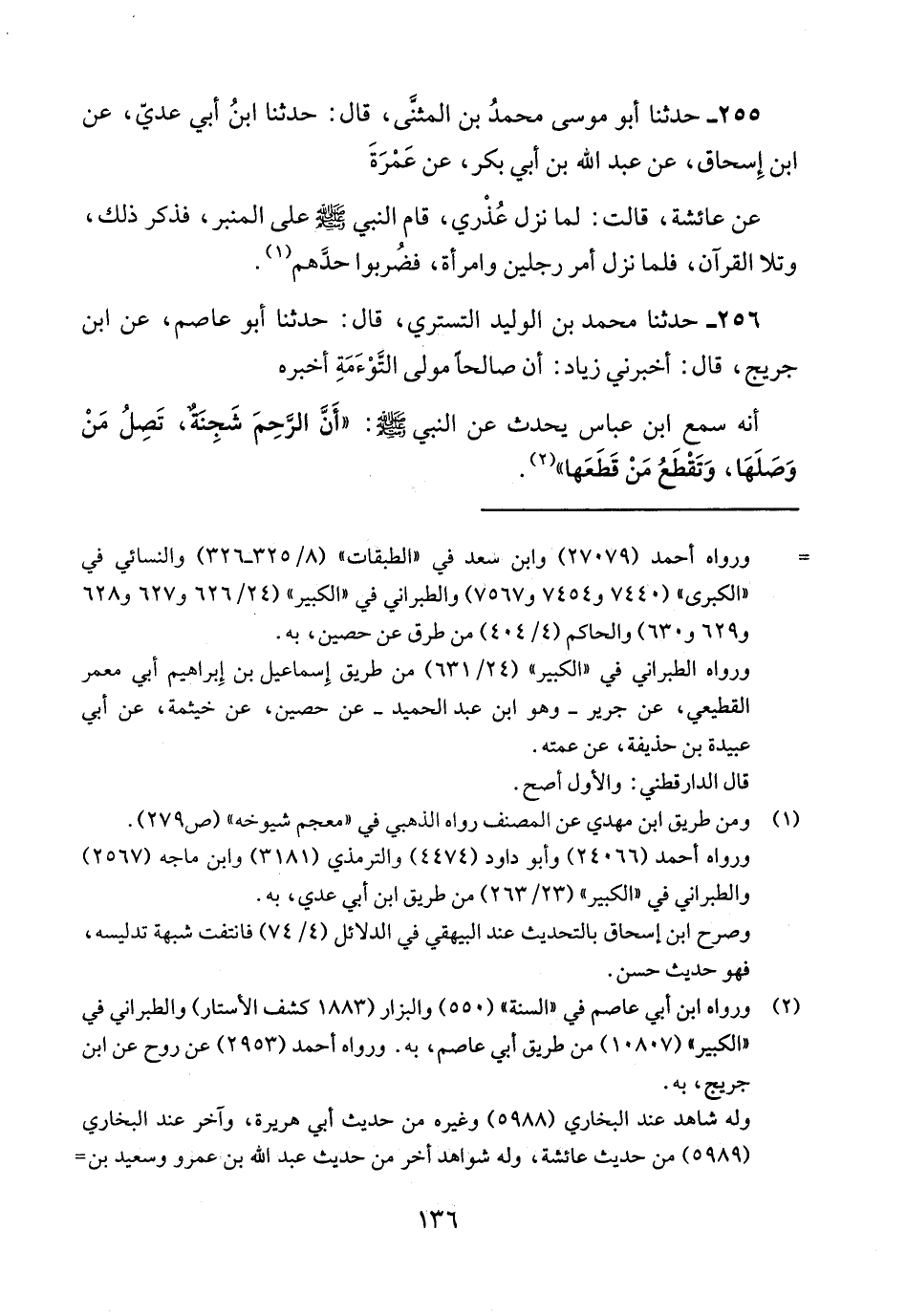 256 - حدثنا محمد بن الوليد التستري قال: حدثنا أَبُو عَاصِمٍ عَنِ ابْنِ جُرَيْجٍ قَالَ: أَخْبَرَنِي زياد أن صالحا مولى التوءمة أَخْبَرَهُ أَنَّهُ سَمِعَ ابْنَ عَبَّاسٍ يُحَدِّثُ عَنِ النَّبِيِّ صَلَّى اللَّهُ عَلَيْهِ وَسَلَّمَ إِنَّ الرَّحِمَ شُجْنَةٌ تَصِلُ مَنْ وَصَلَهَا وَتَقْطَعُ مَنْ قَطَعَهَا.