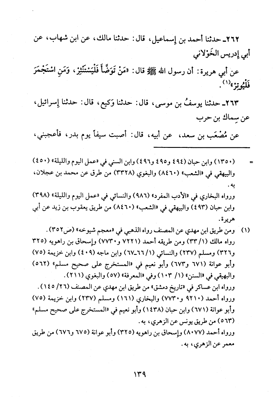 262 - حدثنا أحمد بن إسماعيل قال: حدثنا مَالِكٌ عَنِ ابْنِ شِهَابٍ عَنْ أَبِي إِدْرِيسَ الْخَوْلانِيِّ عَنْ أَبِي هُرَيْرَةَ أَنَّ رَسُولَ اللَّهِ صَلَّى اللَّهُ عَلَيْهِ وَسَلَّمَ قَالَ مَنْ تَوَضَّأَ فليستنثر ومن استجمر فليوتر.