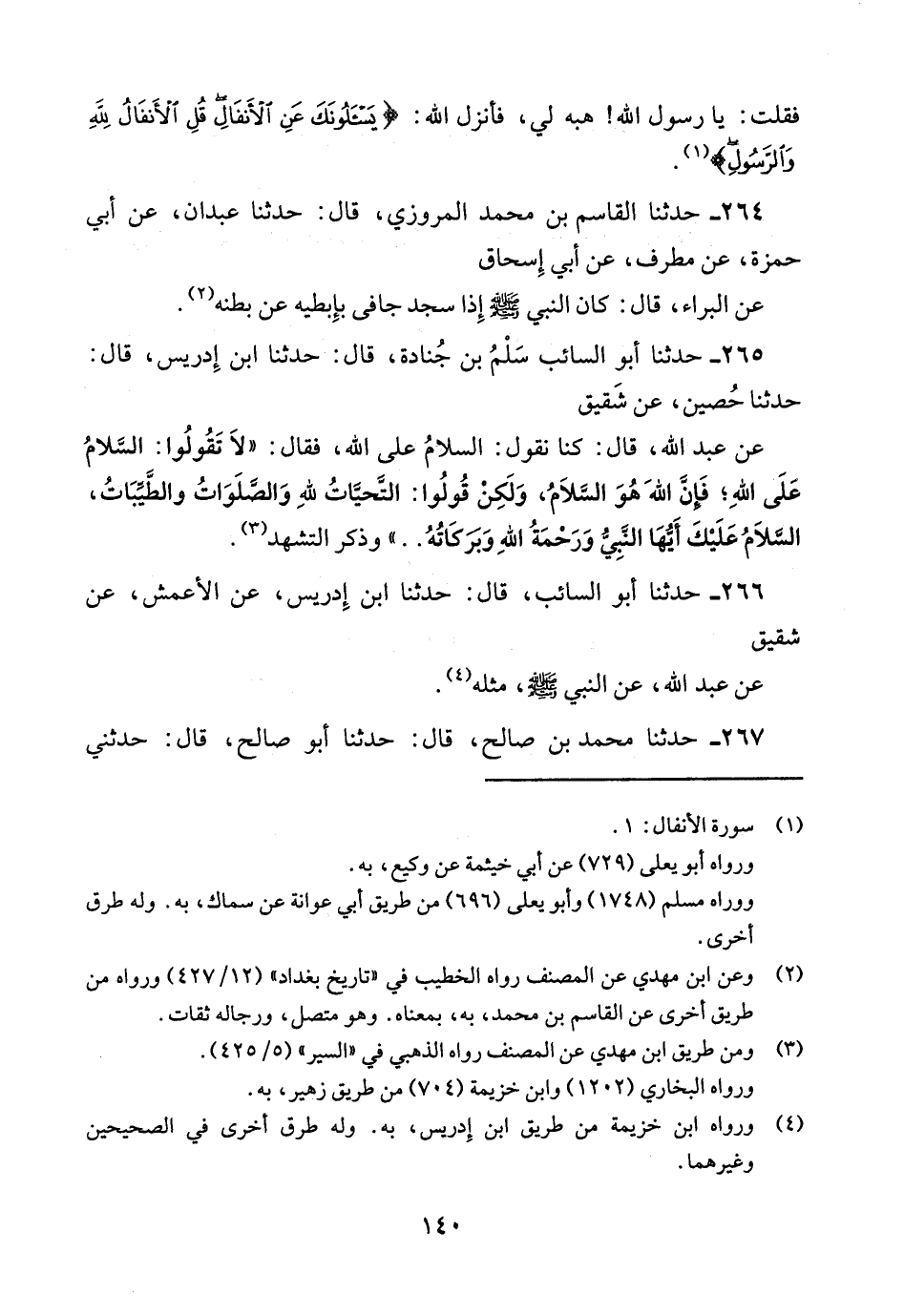 265 - حدثنا أبو السائب سلم بن جنادة قال: حدثنا ابن إدريس قال: حدثنا حُصَيْنٌ عَنْ شَقِيقٍ عَنْ عَبْدِ اللَّهِ قَالَ كُنَّا نَقُولُ السَّلامُ عَلَى اللَّهِ فَقَالَ لا تقولوا السلام على الله فإن الله هوالسلام وَلَكِنْ قُولُوا التَّحِيَّاتُ لِلَّهِ وَالصَّلَوَاتُ وَالطَّيِّبَاتُ السَّلامُ عَلَيْكَ أَيُّهَا النَّبِيُّ وَرَحْمَةُ اللَّهِ وَبَرَكَاتُهُ .. ". وَذَكَرَ التشهد.