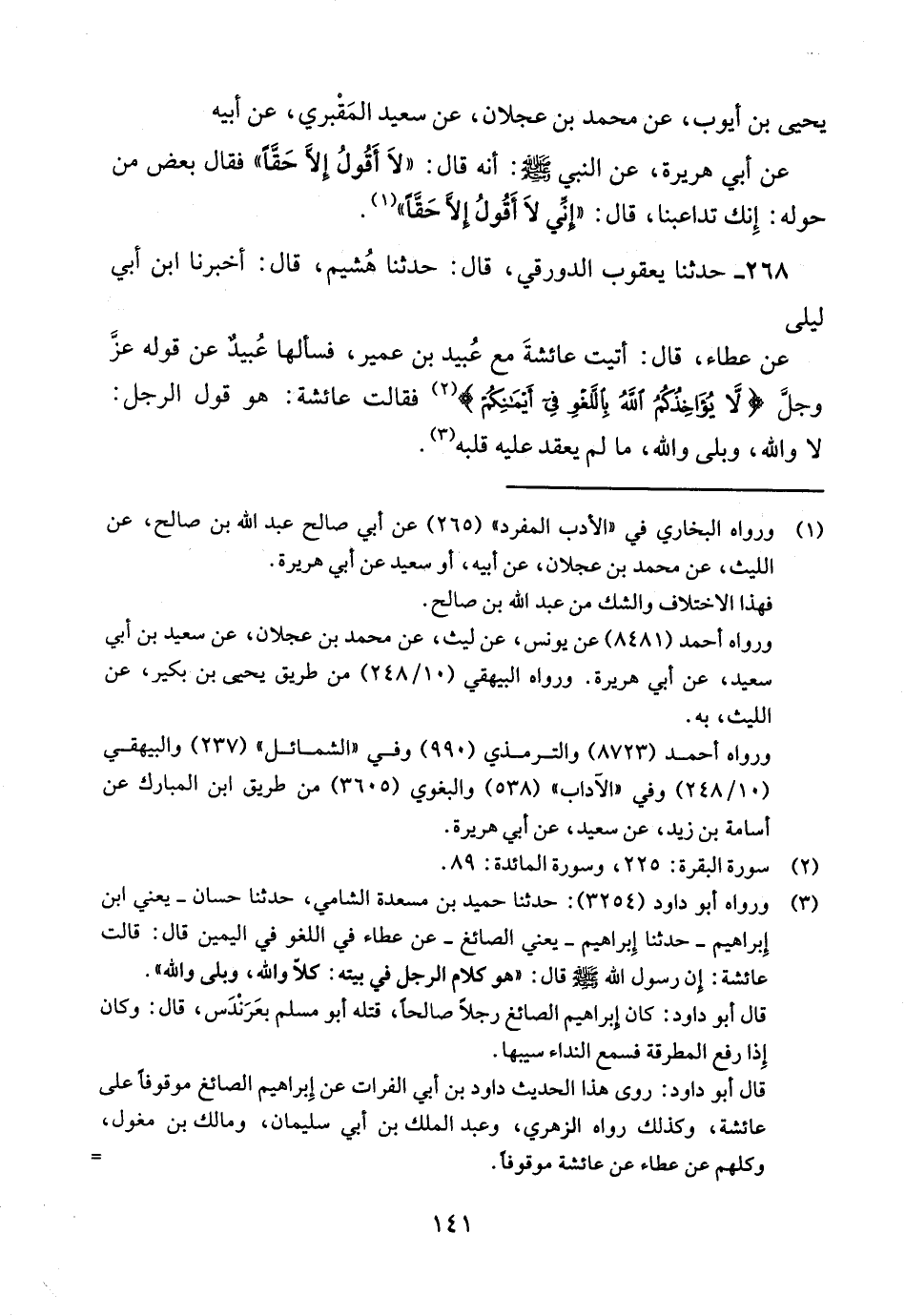 268 - حدثنا يعقوب الدورقي قال: حدثنا هشيم قال: أخبرنا ابْنُ أَبِي لَيْلَى عَنْ عَطَاءٍ قَالَ أَتَيْتُ عائشة مع عبيد بن عمير فسألها عبيد عَنْ قَوْلِهِ عَزَّ وَجَلَّ {لا يُؤَاخِذُكُمُ اللَّهُ باللغو في أيمانكم}. فَقَالَتْ عَائِشَةُ هُوَ قَوْلُ الرَّجُلِ: لا وَاللَّهِ وبلى والله مالم يعقد عليه قلبه.