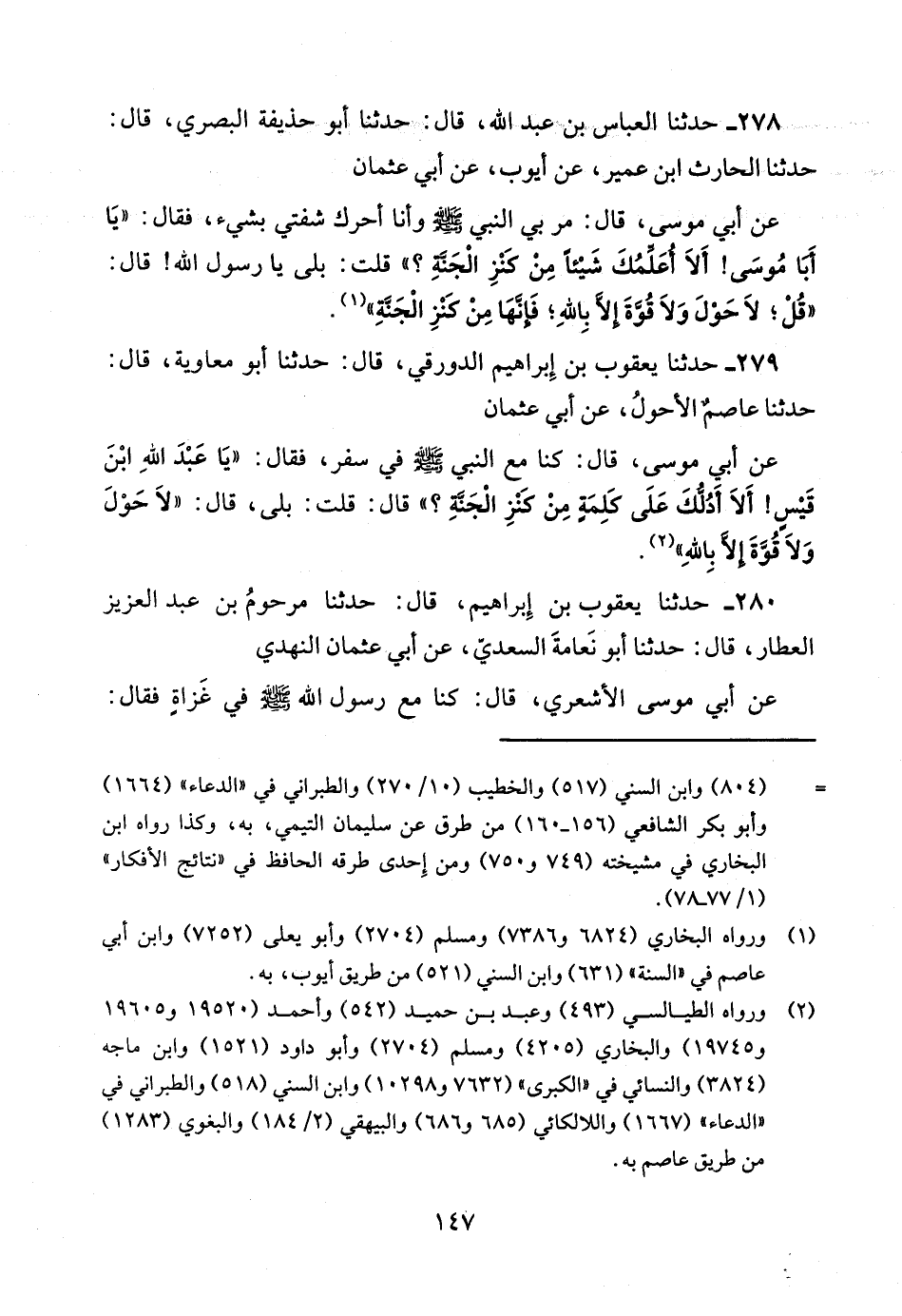 280 - حدثنا يعقوب بن إبراهيم قال: حدثنا مرحوم بن عبد العزيز العطار قال: حدثنا أَبُو نَعَامَةَ السَّعْدِيُّ عَنْ أَبِي عُثْمَانَ النَّهْدي عَنْ أَبِي مُوسَى الأَشْعَرِيِّ قَالَ كُنَّا مَعَ رَسُولِ اللَّهِ صَلَّى اللَّهُ عَلَيْهِ وَسَلَّمَ في غَزَاةٍ فَقَالَ -[148]- يَا عَبْدَ اللَّهِ بْنَ قَيْسٍ أَلا أُعَلِّمُكَ كَنْزًا مِنْ كُنُوزِ الْجَنَّةِ؟ لاَ حولَ وَلاَ قُوَّةَ إِلاَّ بِاللهِ.