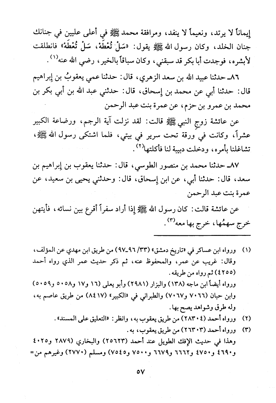 87 - حدثنا محمد بن منصور الطوسي قال: حدثنا يعقوب بن إبراهيم بن سعد قال: حدثنا أبي عن ابن إسحاق قال وحدثني يَحْيَى بْنُ سَعِيدٍ عَنْ عَمْرَةَ بِنْتِ عَبْدِ الرحمن عن عائشة قَالَتْ كَانَ رَسُولُ اللَّهِ صَلَّى اللَّهُ عَلَيْهِ وَسَلَّمَ إِذَا أَرَادَ سَفَرًا أَقْرَعَ بَيْنَ نِسَائِهِ فأيتهن خرج سهمها خرج بها معه.