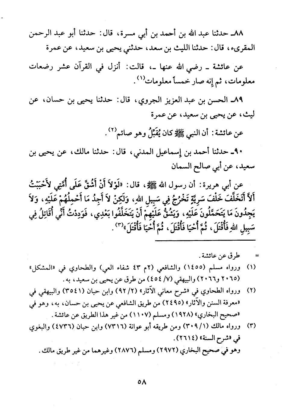 88 - حدثنا عبد الله بن أحمد بن أبي مسرة قال: حدثنا أبو عبد الرحمن المقرئ قال: حدثنا الليث بن سعد حَدَّثَنِي يَحْيَى بْنُ سَعِيدٍ عَنْ عَمْرَةَ عَنْ عَائِشَةَ رَضِيَ اللَّهُ عَنْهَا قَالَتْ أُنْزِلَ فِي الْقُرْآنِ عَشْرُ رَضَعَاتٍ مَعْلُومَاتٍ ثُمَّ إِنَّهُ صَارَ خمسا معلومات.