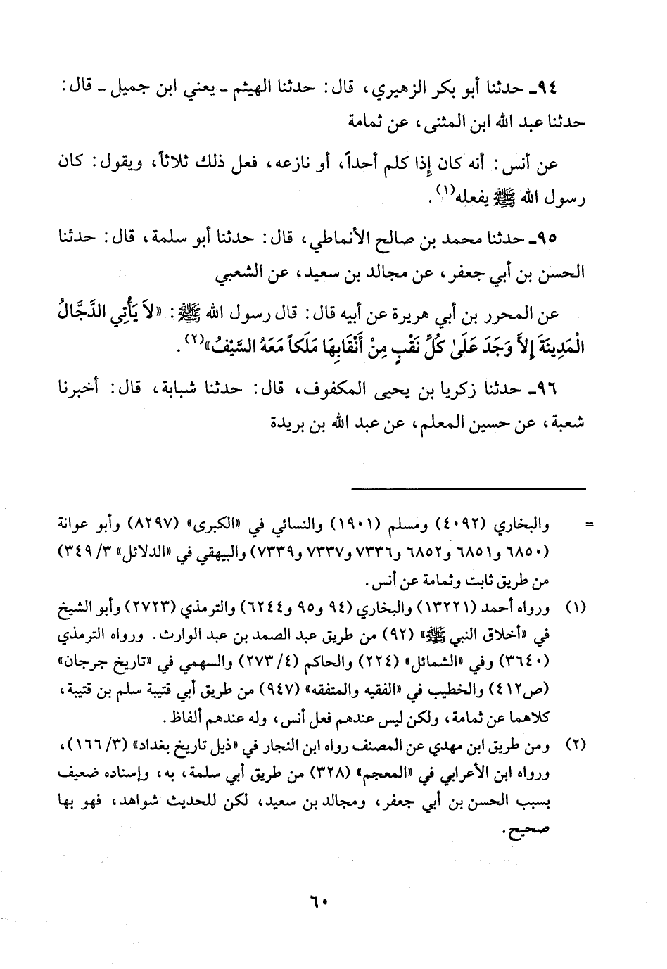94 - حدثنا أبو بكر الزهيري قال: حدثنا الهيثم يعني ابن جميل قال: حدثنا عَبْدُ اللَّهِ بْنُ الْمُثَنَّى عَنْ ثُمَامَةَ عَنْ أَنَسٍ أَنَّهُ كَانَ إِذَا كَلَّمَ أَحَدًا أَوْ نازعه فعل ذلك ثلاثا ويقول كَانَ رَسُولُ اللَّهِ صَلَّى اللَّهُ عَلَيْهِ وَسَلَّمَ يفعله.
