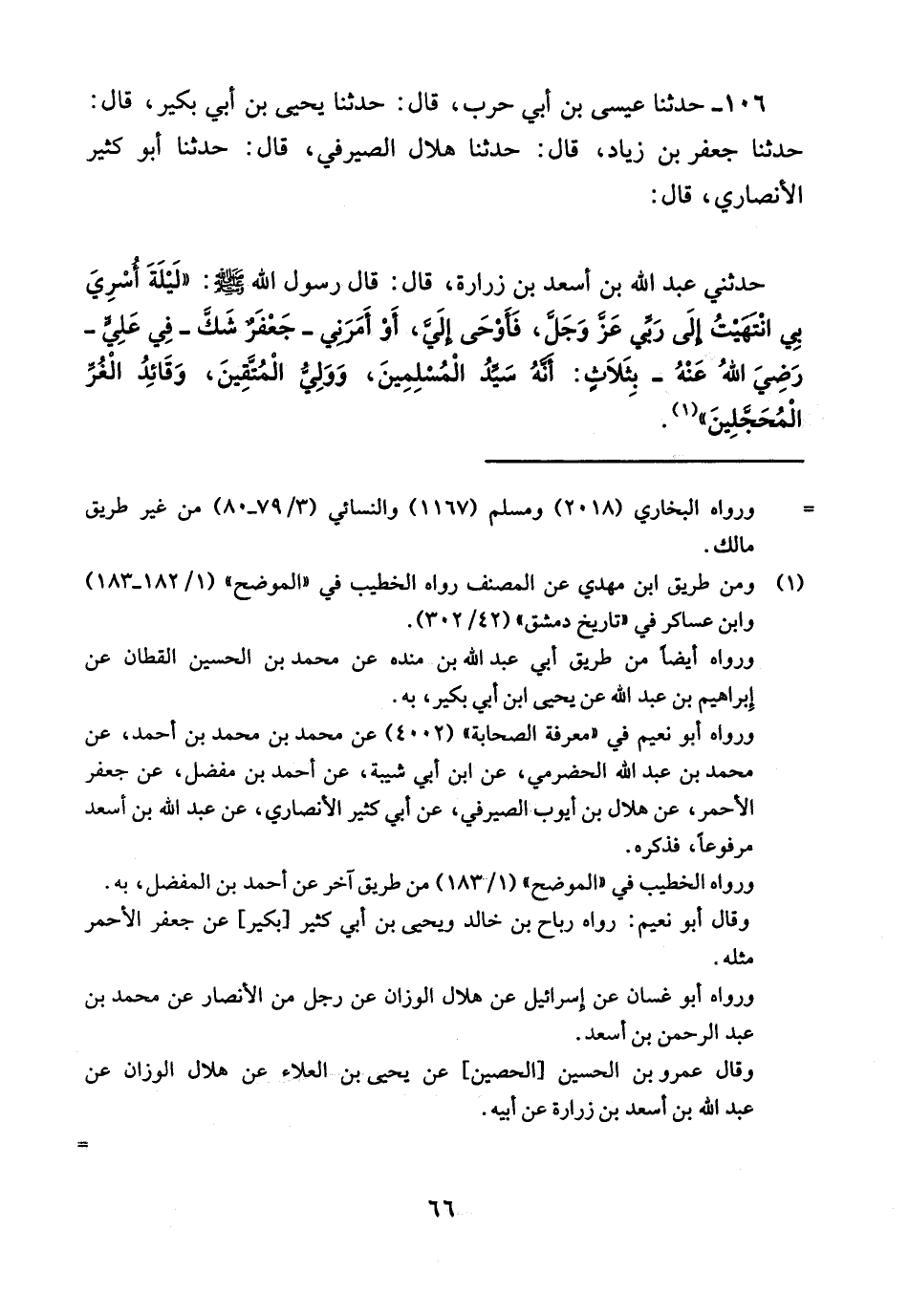 106 - حدثنا عيسى بن أبي حرب قال: حدثنا يحيى بن أبي بكير قال: حدثنا جعفر بن زياد قال: حدثنا هلال الصيرفي قال: حدثنا أَبُو كَثِيرٍ الأَنْصَارِيُّ قَالَ حَدَّثَنِي عَبْدُ اللَّهِ بن أسعد بن زرارة قَالَ: قَالَ رَسُولُ اللَّهِ صَلَّى اللَّهُ عَلَيْهِ وَسَلَّمَ لَيْلَةَ أُسْرِيَ بِي انْتَهَيْتُ إِلَى رَبِّي عَزَّ وَجَلَّ فَأَوْحَى إِلَيَّ أَوْ أَمَرَنِي ـ جَعْفَرٌ شَكَّ ـ فِي عَلِيٍّ رَضِيَ اللَّهُ عَنْهُ بِثَلاثٍ أَنَّهُ سَيِّدُ الْمُسْلِمِينَ وَوَلِيُّ الْمُتَّقِينَ وَقَائِدُ الْغُرِّ المحجلين.