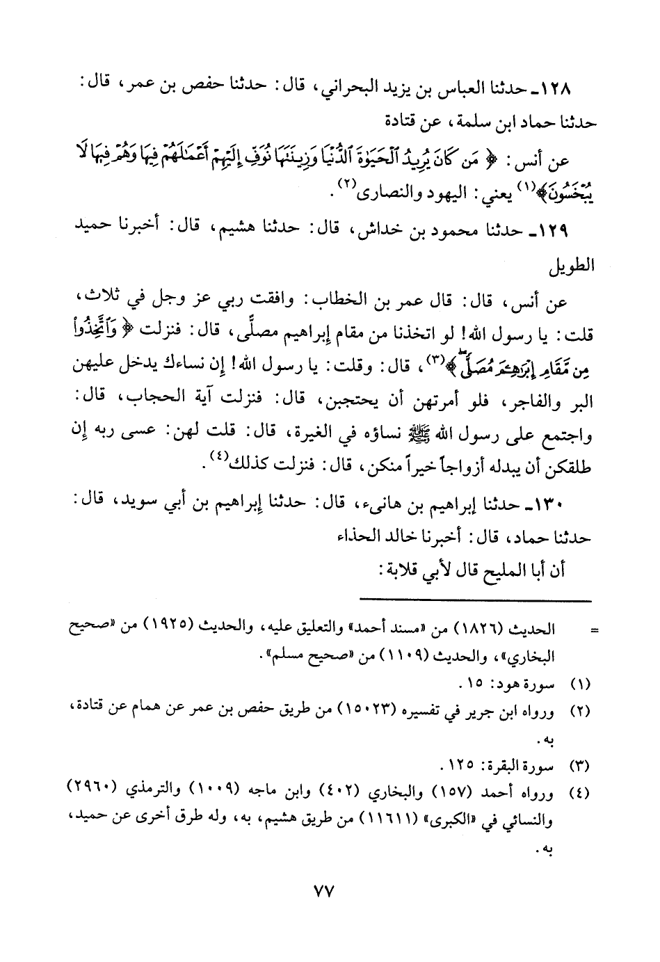 129 - حدثنا محمود بن خداش قال: حدثنا هُشَيْمٌ قَالَ: أَخْبَرَنَا حُمَيْدٌ الطَّوِيلُ عَنْ أَنَسٍ قال قال عمر بن الخطاب وافقت ربي عز وجل في ثلاث قُلْتُ يَا رَسُولَ اللَّهِ لَوِ اتَّخَذْنَا مِنْ مَقَامِ إِبْرَاهِيمَ مُصَلًّى قَالَ فَنَزَلَتْ {وَاتَّخِذُوا مِنْ مقام إبراهيم مصلى} قال وقلت يا رسول الله إن نسائك يَدْخُلُ عَلَيْهِنَّ الْبَرُّ وَالْفَاجِرُ فَلَوْ أَمَرْتَهُنَّ أَنْ يَحْتَجِبْنَ قَالَ فَنَزَلَتْ آيَةُ الْحِجَابِ قَالَ وَاجْتَمَعَ عَلَى رَسُولِ اللَّهِ صَلَّى اللَّهُ عَلَيْهِ وَسَلَّمَ نِسَاؤُهُ فِي الْغِيرَةِ قَالَ قُلْتُ لَهُنَّ عَسَى رَبُّهُ إِنْ طَلَّقَكُنَّ أَنْ يُبْدِلَهُ أَزْوَاجًا خَيْرًا منكن قال فنزلت كذلك.
