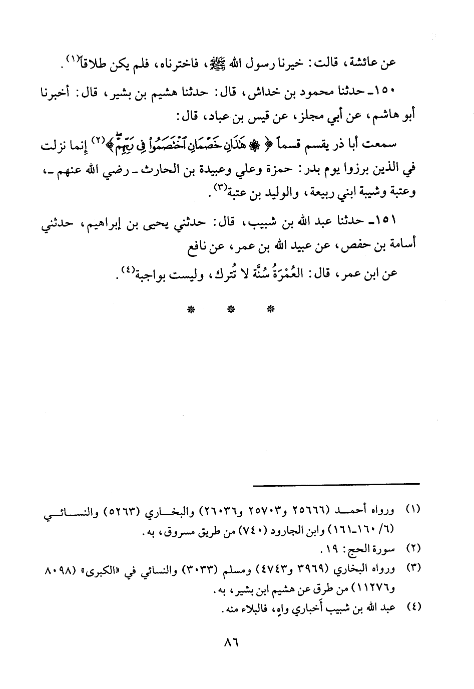 151 - حدثنا عَبْدُ اللَّهِ بْنُ شَبِيبٍ قَالَ: حَدَّثَنِي يَحْيَى بن إبراهيم حَدَّثَنِي أُسَامَةُ بْنُ حَفْصٍ عَنْ عُبَيْدِ اللَّهِ بْنِ عُمَرَ عَنْ نَافِعٍ عَنِ ابْنِ عُمَرَ قَالَ الْعُمْرَةُ سُنَّةٌ لا تُتْرَكُ وَلَيْسَتْ بِوَاجِبَةٍ.