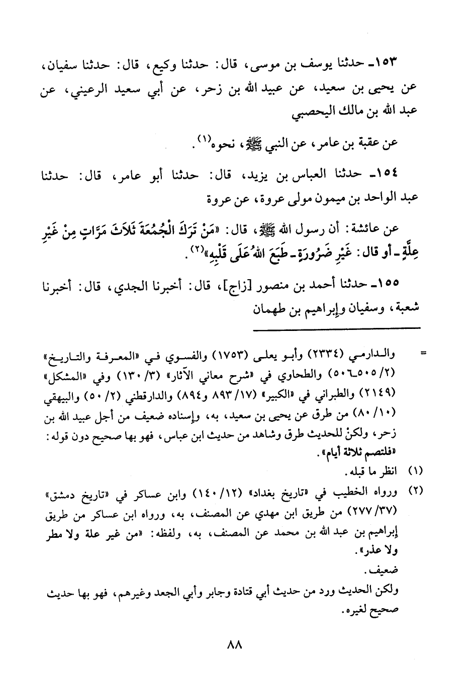 154 - حدثنا العباس بن يزيد قال: حدثنا أبو عامر قال: حدثنا عبد الواحد بن ميمون مولى عروة عن عروة عن عائشة أن رسول الله صلى الله عليه وسلم قال من ترك الجمعة ثلاث مرات من غير علة أو قال غير ضرورة طبع الله على قلبه.