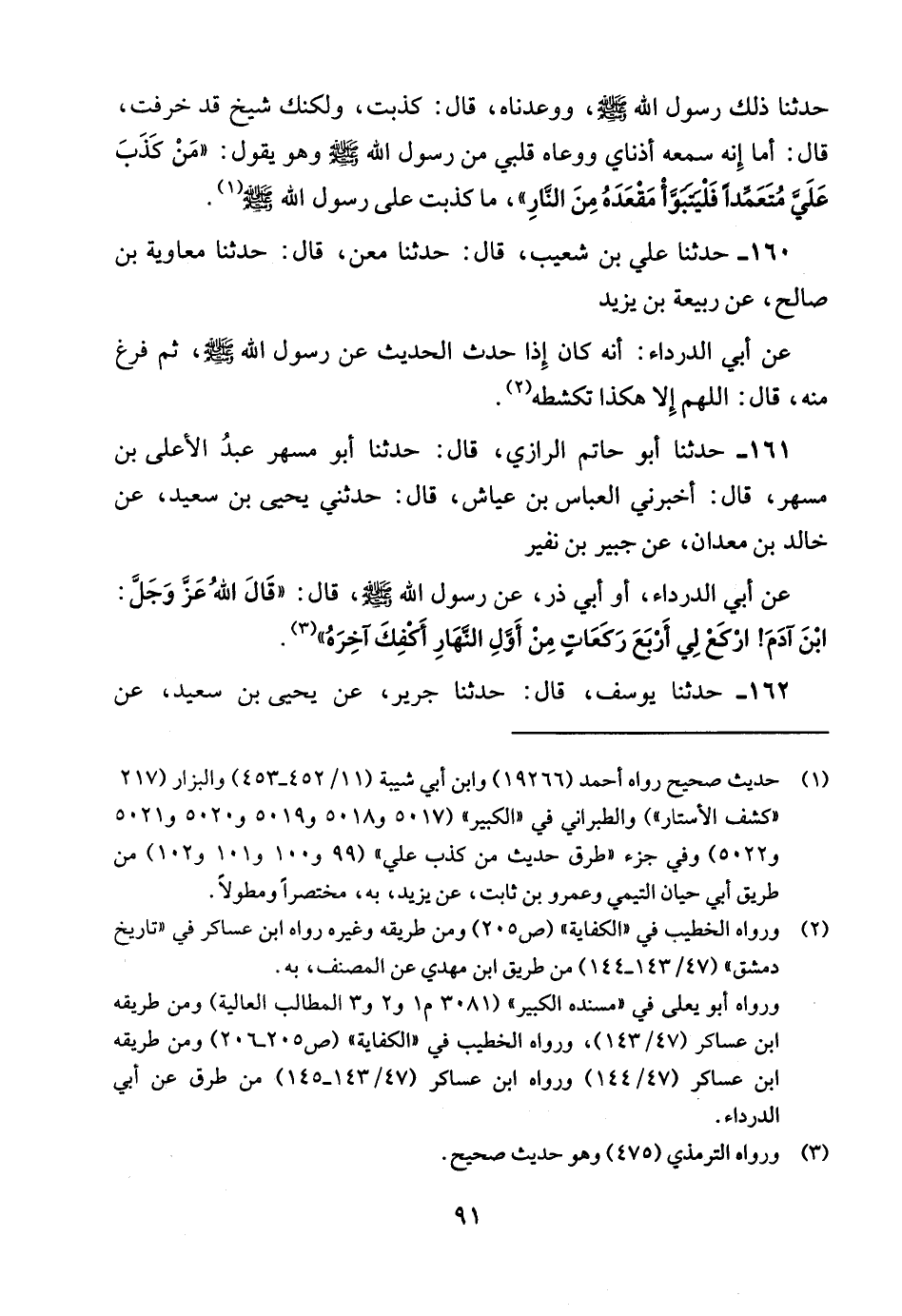 161 - حدثنا أبو حاتم الرازي قال: حدثنا أبو مسهر عبد الأعلى بن مسهر قال: أخبرني العباس بن عياش قال: حدثني يحيى بن سعيد عن خالد بن معدان عن جبير بن نفير عن أبي الدرداء أو أبي ذر عَنْ رَسُولِ اللَّهِ صَلَّى اللَّهُ عَلَيْهِ وَسَلَّمَ قال قال الله عز وجل ابن آدم اركع لي أربع ركعات من أول النهار أكفك آخره.