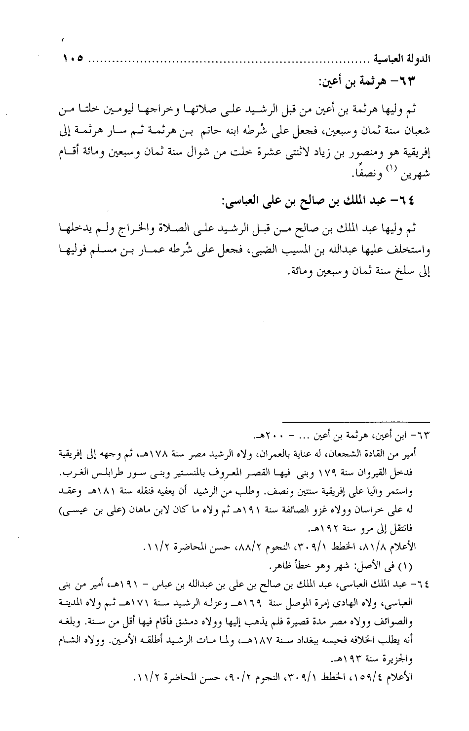 ثمَّ ولِيَها هَرْثَمة بْن أَعْيَن من قِبَل الرشيد عَلَى صلاتها وخَراجها ليومين خلتا من شعبان سنة ثمان وسبعين فجعل عَلَى شُرَطه ابنه حاتم بْن هَرْثَمة، ثمَّ سار هَرْثَمة إلى إفريقيَّة هُوَ ومنصور بْن زياد لاثنتي عشرة خلت من شوَّال سنة ثمان وسبعين ومائة، أقام شهرين ونصفًا.