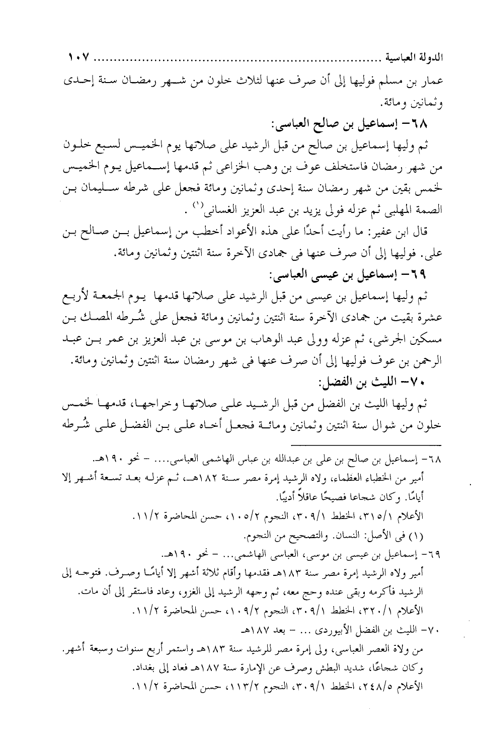 ثمَّ ولِيَها إسماعيل بْن صالح من قِبَل الرشيد عَلَى صلاتها يوم الخميس لسبع خلونَ من شهر رمضان فاستخلف عَوْف بْن وَهْب الخُزاعيّ، ثمَّ قدِمها إسماعيل يوم الخميس لخمس بقينَ من شهر رمضان سنة إحدى وثمانين ومائة فجعل عَلَى شُرَطه سُلَيْمَان بْن الصِّمّة المُهَلَّبيّ، ثمَّ عزله فولَّى يزيد بْن عَبْد العزيز الغَسَّانيّ.
