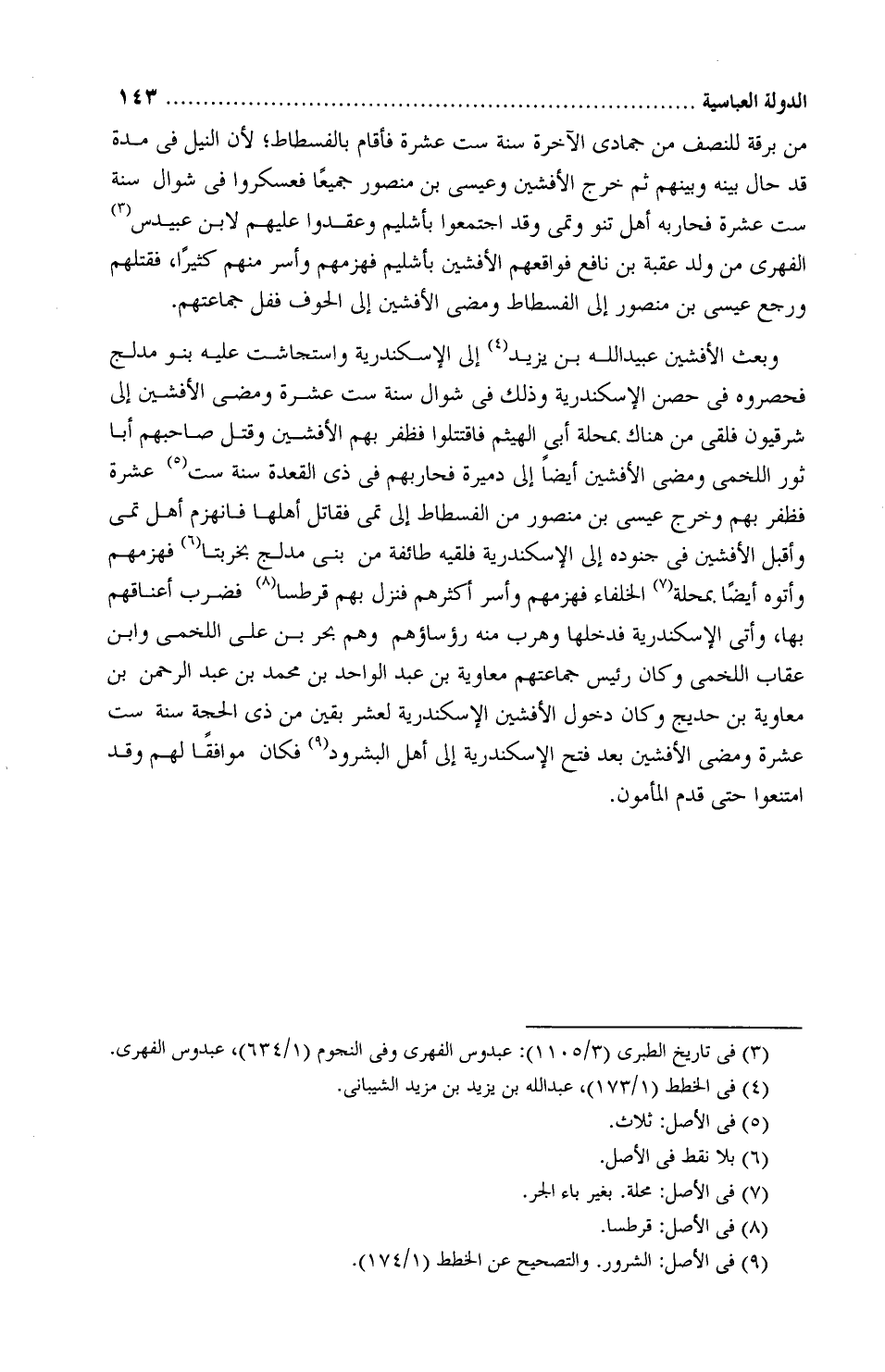 من بَرْقة للنصف من جمادى الآخرة سنة ستّ عشرة، فأقام بالفُسطاط لأن النيل فِي مدّه قد حال بينه وبينهم، ثمَّ خرج الأَفْشِين، وعيسى بْن منصور جميعًا، فعسكروا بأَشْلِيم، وعقدوا عليهم لابن عُبَيْدُس الفِهْريّ من ولَد عُقْبة بْن نافع، فواقعهم الأَفْشِين بأَشْلِيم، فهزمهم وأسر منهم كثيرًا، فقتلهم، ورجع عيسى بْن منصور إلى الفُسطاط، ومضى الأَفْشين إلى الحَوْف ففلّ جماعتهم.