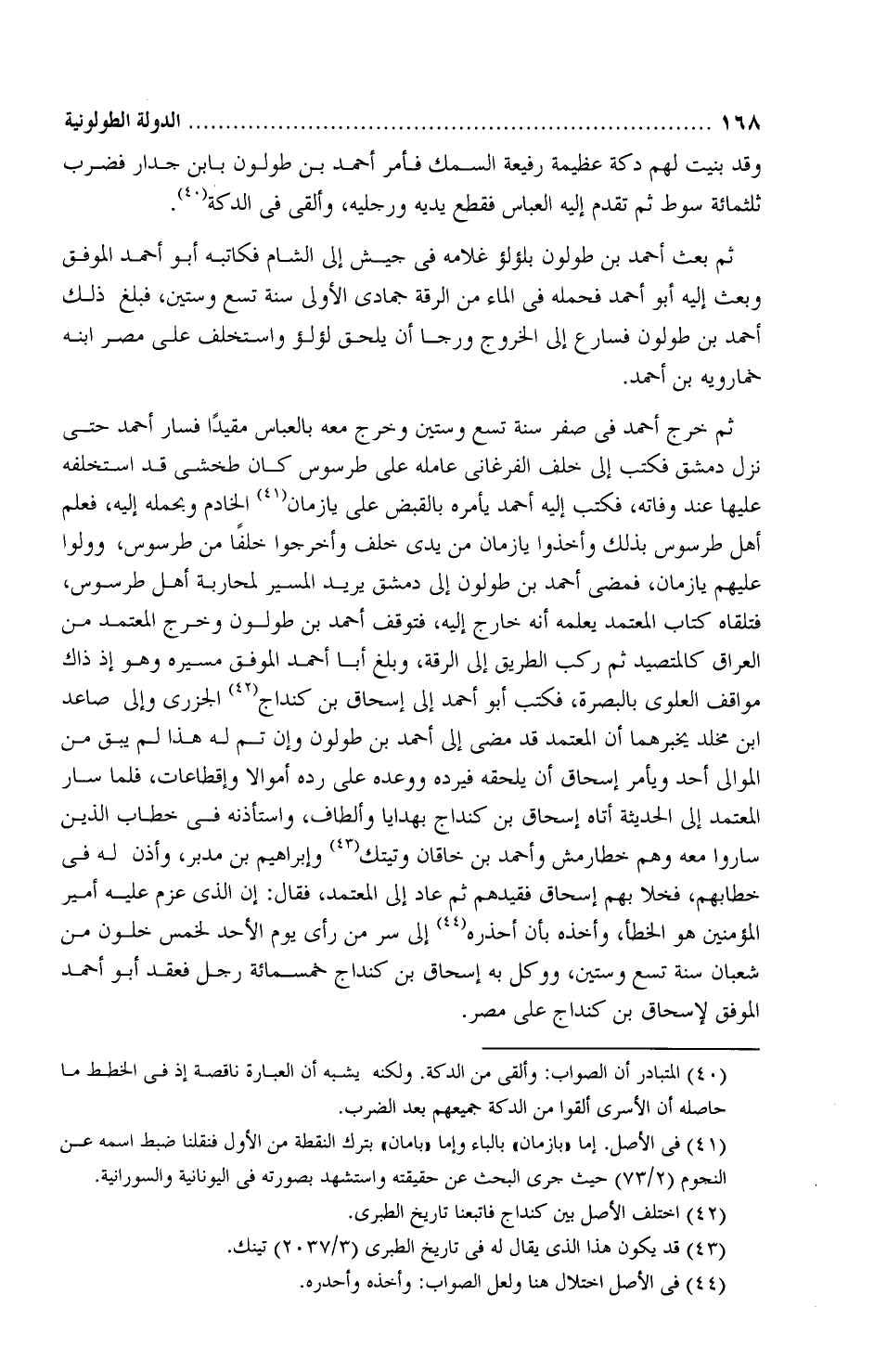 ثمَّ خرج أحمد فِي صفر سنة تسع وستّين وخرج معه بالعبَّاس مقَيَّدًا، فسار أحمد حتى نزل دِمَشْق، فكتب إلى خَلَف الفَرْغانيّ عامله عَلَى طُرْسُوس، كَانَ طخشي قد استخلفه عليها عند وفاته، فكتب إِلَيْهِ أحمد يأْمره بالقبض عَلَى يازَمان الخادم ويجمله إِلَيْهِ، فعلِم أهل طُرْسُوس بذلك، وأخذوا يا زَمان من يدَى خَلَفًا من طُرْسُوس، وولَّوا عليهم يازَمان، فمضى أحمد بْن طُولُون إلى دِمَشْق يُريد المسير لمحارَبة أهل طُرسُوس، فتلقَّاه كِتاب المُعتمِد يُعلمه أَنَّهُ خارج إِلَيْهِ، فتوقف أحمد بْن طُولُون، وخرج المعتمِد من العِراق كالمتصِّد ثمَّ ركِب الطريق إلى الرَّقَّة، وبلغ أَبَا أحمد الموفَّق مسيره وهو إذ ذاك مواقِف العَلَويّ بالبَصرة، فكتب أَبُو أحمد إلى إِسْحَاق بْن كُنداج الجَزَريّ، والي صاعد بْن مَخْلَد يُخبرهما أن المُعتمِد قد مضى إلى أحمد بْن طُولُون، وإن تمّ لَهُ هذا لم يبقَ من الموالي أحدٌ، ويأمر إِسْحَاق أن يلحقه، فيردّه، ووعده عَلَى ردّه أموالًا وإِقطاعات، فلمَّا سار المُعتمِد إلى الحدِيثة أتاه إِسْحَاق بْن كُنداج بهدايا وألطاف، واستأذنه فِي خِطاب الَّذِي ساروا معه وهم خطارمِش، وأحمد بْن خاقان، وتيتك، وإبراهيم بْن مُدَّبر، وأذِن لَهُ فِي خِطابهم، فخلا بهم إِسْحَاق، فقيَّدهم، ثمَّ عاد إلى المُعتمِد، فقال: إن الَّذِي عزم عَلَيْهِ أمير المؤمنين هُوَ الخطأ.