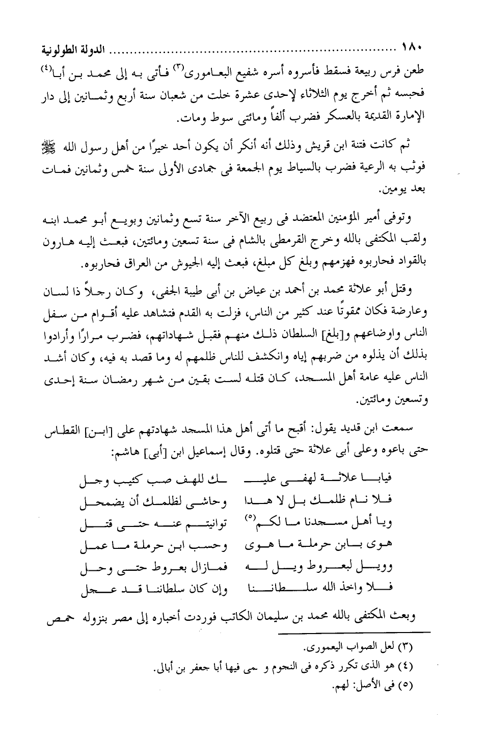 وقُتل أَبُو عُلائة محمد بْن أحمد بْن عِياض بْن أَبِي طَيْبة الجفي، وكان رجُلًا ذا لِسان وعارضة، فكان ممقوتًا عِند كثير من الناس، فزلَّت بِهِ القدَم، فتشاهد عَلَيْهِ أقوام من سِفَل الناس وأوضاعهم، وبلغ السُّلطان ذَلكَ منهم فقبل شهاداتهم، فضرب مرارا، وأرادوا بذلك أن يذلوه من ضربهم إياه، وانكشف للناس ظلمهم له، وما قصد به فيه، وكان اشد الناس عليه عامة اهل المسجد، كان قتله لست بقين من شهر رمضان سنة إحدى وتسعين ومائتين.