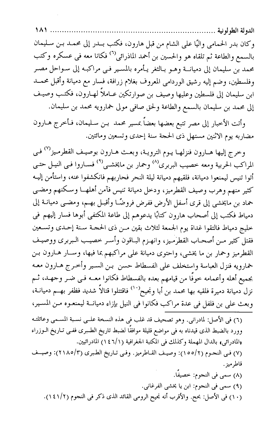 وخرج إليها هارون فنزلها يوم التروية، وبعث هارون بوصيف القطرميز في المراكب الحربية، ومعه: خصيف البربري، وحماد بن ما يخشي فساروا في النيل حتى أتوا تنيس ليمنعوا دميانة، فلقيهم دميانة ليلة النحر، فحاربهم، فانكشفوا عنه، واستأمن إليه كثير منهم، وهرب وصيف القطرميز، ودخل دميانة تنيس، فآمن أهلها وسكنهم، ومضى حماد بن مايخشي إلى قرى أسفل الأرض، ففرض فروضا وأقبل بهم، ومضى دميانة إلى دمياط، فكتب إلى أصحاب هارون كتابا يدعوهم إلى طاعة المكتفي، أبوها، فسار إليهم في خليج دمياط، فالتقوا غداة يوم الجمعة لثلاث بقين من ذي الحجة سنة إحدى وتسعين، فقتل كثير من أصحاب القطرميز، وانهزم الباقُون، وأُسر خَصيب البَرْبَريّ، ووَصِيف القَطرميز، وحماد بْن ما يخشي، واحتوى دَمْيانة عَلَى مراكبهم بما فيها، وسار هارون بْن خُمارَوَيه فنزل العبَّاسة واستخلف عَلَى الفُسطاط حسن بْن السَّيْر، وأخرج هارون معه بجميع أهله وأعمامه خوفًا من قيامهم بعده بالفُسطاط، فكانوا معه فِي ضُرّ وجَهد، ثمَّ نزل دَمْيانة دَمِيرة، فلقِيَه بها محمد بْن أبَّا، ونجيح، فاقتتلوا قتالًا شديدًا، فظَفِر بهم دَمْيانة، وبعث عليّ بْن فُلْفُل فِي عِدَّة مراكب، فكانوا فِي النِّيل بإِزاء دَمْيانة ليمنعوه من المسير،