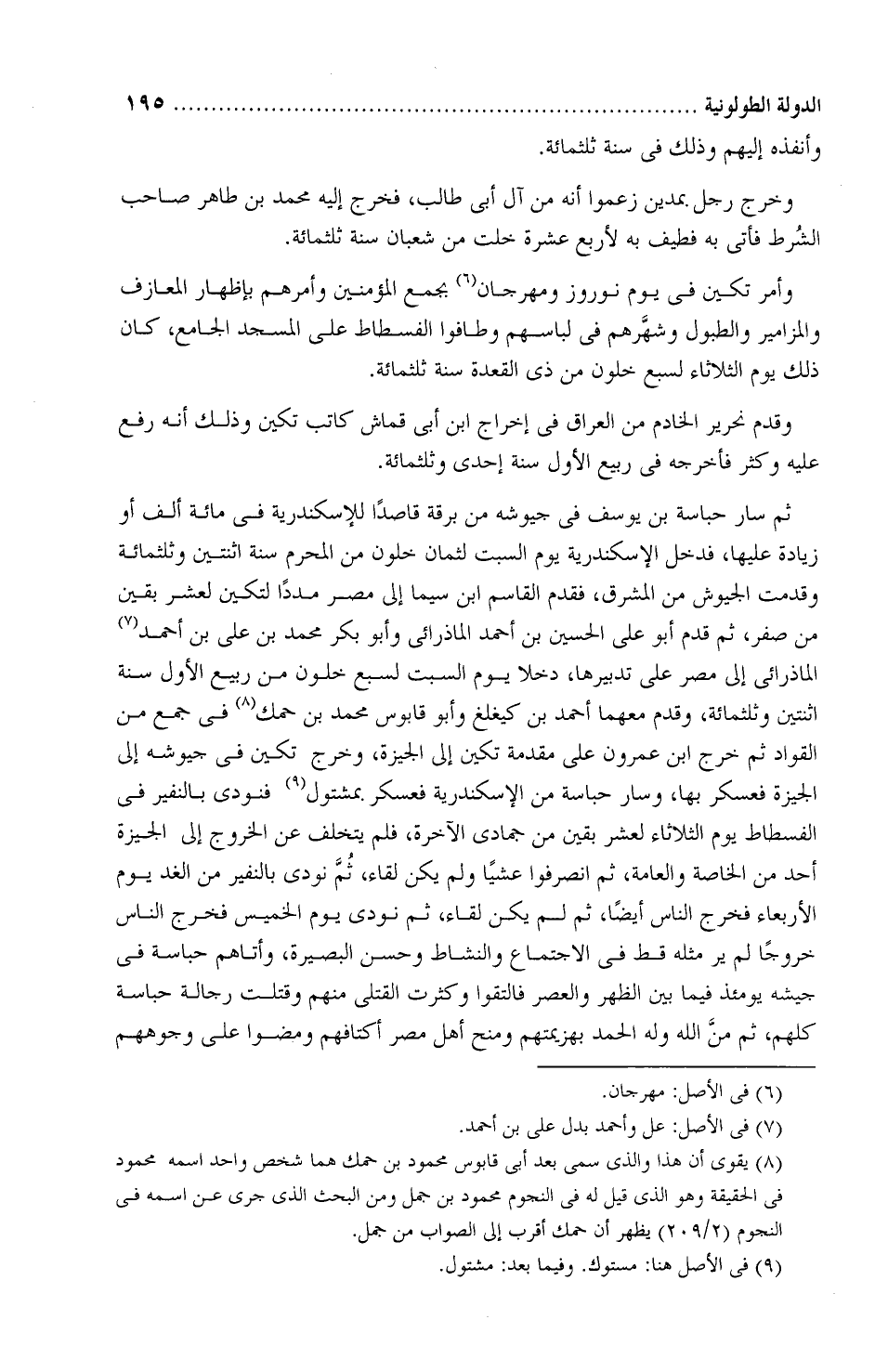 وقدِم نحرير الخادم من العِراق فِي إخراج ابن أَبِي قماش كاتب تكِين وذلك أنَّه رُفع عَلَيْهِ وكثر، فأخرجه فِي ربيع الأوَّل سنة إحدى وثلاثمائة، ثمَّ سار حَباسة بْن يوسف فِي جيوشه من بَرْقة قاصدًا للإِسكندريَّة فِي مائة ألف أو زيادة عليها، فدخل الإِسكندريَّة يوم السبت لثمان خلونَ من المحرَّم سنة اثنتين وثلاثمائة، وقدِمت الجيوش من المشرِق، فقدِم القاسم بن سِيما إلى مِصر مدَدًا لتَكِين لعشر بقينَ من صفر، ثمّ قدِم أَبُو عليّ الْحُسَيْن بْن أحمد الماذَرائيّ، وأبو بَكْر محمد بْن عليّ بْن أحمد الماذَرائيّ إلى مِصر عَلَى تدبيرها دخلا يوم السبت لسبع خلونَ من ربيع الأوَّل سنة اثنتين وثلاثمائة، وقدِم معهما أحمد بْن كَيْغلَغ، وأبو قابوس محمد بْن حمك فِي جمع من القُوَّاد، ثمَّ خرج ابن عمرون عَلَى مقدَّمة تَكِين إلى الجِيزة، وخرج تَكِين فِي جيُوشه إلى الجِيزة، فعسكر بها وسار حَباسة من الإِسكندريَّة، فعسكر بمَشْتُول، فنُودي بالنفير فِي الفُسطاط يوم الثلاثاء لعشر بقينَ من جمادى الآخرة، فلم يتخلَّف عَن الخروج إلى الجِيزة أحد من الخاصَّة والعامَّة، ثمَّ انصرفوا عشيًّا ولم يكُن لِقاء، ثمَّ نُودي بالنفير من الغد يوم الأربعاء، فخرج الناس أيضًا ثمَّ لم يكن لِقاء، ثمَّ نُودِي يوم الخميس، فخرج الناس خروجًا لم يُرَ مِثله قطّ فِي الاجتماع والنشاط وحُسن البصيرة، وأتاهم حَباسة فِي جيشه يومئذ فيما بين الظُّهر والعصر، فالتقَّوا وكثُرت القتلى منهم، وقُتِلت رجَّاله حَباسة كلُّهم، ثمَّ منَّ اللَّه وله الحمد بهزيمتهم، ومنح أهل مِصر أكتافهم، ومضَوا عَلَى وجوههم