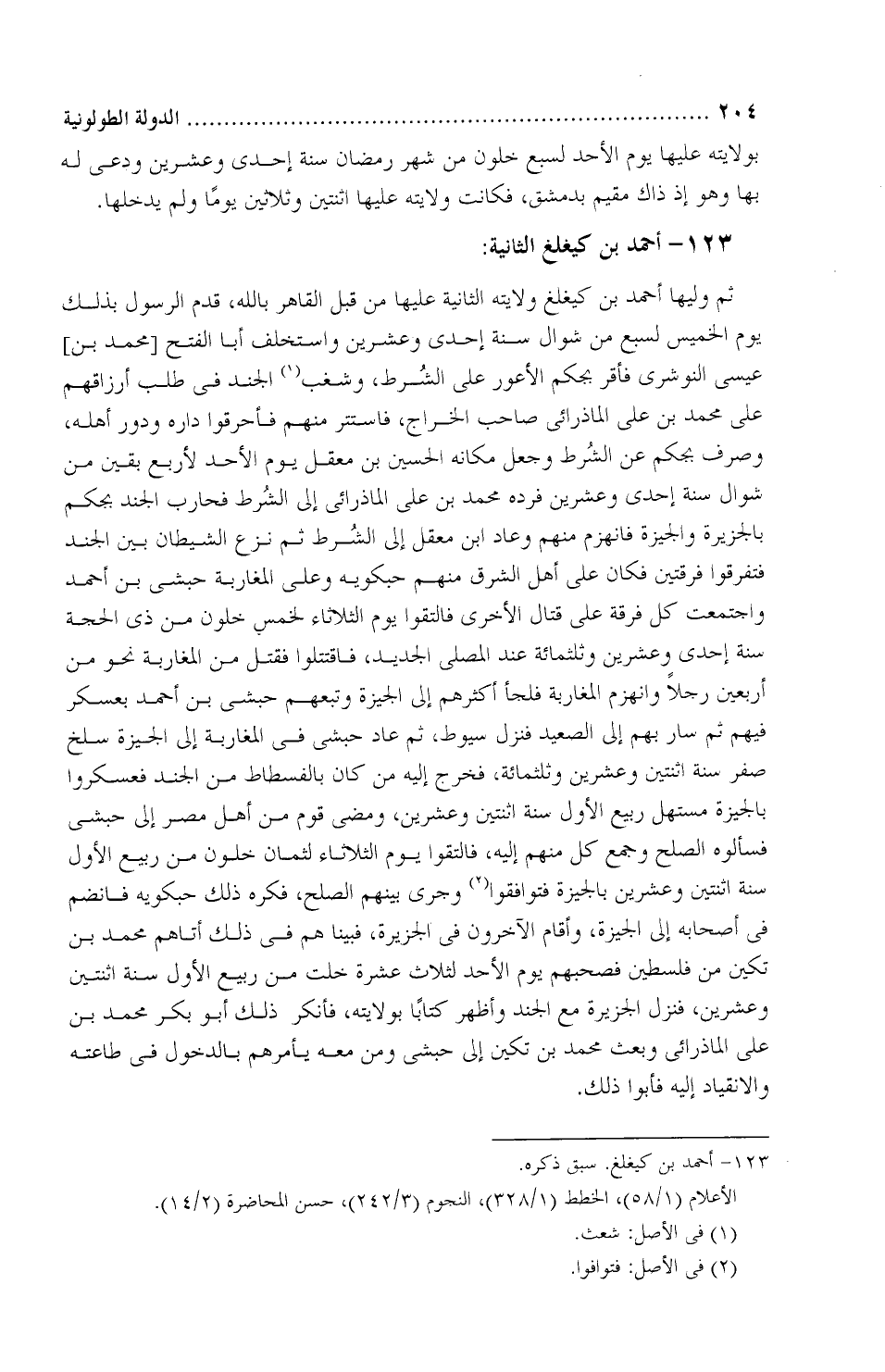ثمَّ ولِيَها أحمد بْن كَيْغَلَغ وِلايته الثانية عليها من قِبَل القاهر بالله، قدم الرَّسُول بذلك يوم الخميس لسبع من شوَّال سنة إحدى وعشرين واستخلف أَبَا الفتح محمد بْن عيسى النُّوشَري، فأقرّ بجكَم الأَعور عَلَى الشُّرَط، وشغب الجُند فِي طلَب أرزاقهم عَلَى محمد بْن عليّ الماذَرائيّ صاحب الخَراج، فاستتر منهم، فأحرقوا داره ودُور أهله، وصرف بجكم عَن الشُّرَط وجعل مكانه الحُسين بْن مَعقِل يوم الأحد لأربع بقِينَ من شوَّال سنة إحدى وعشرين، فردَّه محمد بْن عليّ الماذَرائيّ إلى الشرط، فحارب الجُند بجكم بالجزيرة والجِيزة، فانهزم منهم، وعاد ابن مَعقِل إلى الشُّرَط، ثمَّ نزع الشيطان بين الجُند فتفرَّقوا فِرقتين، فكان عَلَى أهل الشرق منهم حبكويه، وعلى المَغاربة حَبَشيّ بْن أحمد، واجتمعت كل فِرقة عَلَى قتال الأُخرى، فالتقّوا يوم الثلاثاء لخمس خلونَ من ذي الحجَّة سنة إحدى وعشرين وثلاثمائة عند المُصلَّى الجديد، فاقتتلوا، فقُتِل من المَغاربة نحو من أربعين رجُلًا، وانهزم المَغاربة، فلجأَ أكثرهم إلى الجِيزة، وتبِعهم حَبَشيّ بْن أحمد بعسكر فيهم، ثمَّ سار بهم إلى الصعيد، فنزل سُيُوط، ثمَّ عاد حَبَشيّ فِي المَغاربة إلى الجيزة سلخ صفر سنة اثنتين وعشرين وثلاثمائة، فخرج إِلَيْهِ من كَانَ بالفُسطاط من الجُند، فعسكروا بالجِيزة مستهلّ ربيع الأوَّل سنة اثنتين وعشرين، ومضى قوم من أهل مِصر إلى حَبَشيّ، فسأَلوه الصُّلح وجمع كل منهم إِلَيْهِ، فالتقّوا يوم الثلاثاء لثمان خلونَ من ربيع الأوَّل سنة اثنتين وعشرين بالجِيزة، فتوافقوا وجرى بينهم الصُّلح، فكرِه ذَلكَ حبكويه، فانضمّ فِي أصحابه إلى الجِيزة، وأقام الآخرون فِي الجزيرة، فبينا هُمْ فِي ذَلكَ أتاهم محمد بْن تَكِين من فِلَسطين، فصبَّحهم يوم الأحد لثلاث عشرة خلت من ربيع الأوَّل سنة اثنتين وعشرين، فنزل الجزيرة مَعَ الجُند، وأظهر كتابًا بوِلايته، فأنكر ذَلكَ أَبُو بَكْر محمد بْن عليّ الماذَرائيّ، وبعث محمد بْن تَكِين إلى حَبَشيّ ومن معه يأمرهم بالدخول فِي طاعته، والانقياد إِلَيْهِ، فأَبَوا ذَلكَ.