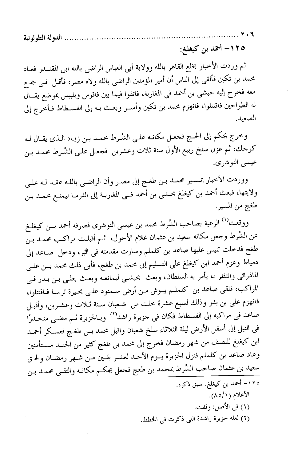 ووقعت الرعيَّة بصاحب الشُّرَط محمد بْن عيسى النُّوشَري، فصرفه أحمد بْن كَيْغَلَغ عَن الشُّرَط وجعل مكانه سَعِيد بْن عثمان غُلام الأحول، ثمَّ أقبلت مراكب محمد بْن طُغْج، فدخلت تَنِّيس عليها صاعد بن كَلملم، وسارت مُقدَّمته فِي البرّ، ودخل صاعد إلى دِمْياط، وعزم أحمد بن كَيْغَلَغ عَلَى التسليم إلى محمد بْن طُغْج، فأبى ذَلكَ محمد بْن عليّ الماذَرائيّ وانتظر ما يأمر بِهِ السُّلطان، وبعث بحَبَشيّ ليمانعه، وبعث بعليّ بْن بدر فِي المراكب، فلقي صاعد بْن كَلملم ببوش من أرض سَمَنُّود عَلَى بُحَيرة ترسا، فاقتتلوا، فانهزم عليّ بْن بدر وذلك لسبع عشرة خلت من شعبان سنة ثلاث وعشرين، وأقبل صاعد فِي مراكبه إلى الفُسطاط، فكان فِي جزيرة راشد وبالجزية، ثمَّ مضى منحدِرًا فِي النيل إلى أسفل الأرض ليلة الثلاثاء شعبان، وأقبل محمد بْن طُغْج، فعسكر أحمد بْن كَيْغَلَغ للنصف من شهر رمضان، فخرج إلى محمد بْن طُغْج، فخرج إلى محمد بْن طُغج كثير من الجُند مستأْمنين، وعاد صاعد بْن كَلملم، فنزل الجزيرة يوم الأحد لعشر بقينَ من شهر رمضان ولحِق سَعِيد بْن عثمان صاحب الشُّرَط بمحمد بْن طُغْج، فجُعل بجكَم مكانه، والتقى محمد بْن
