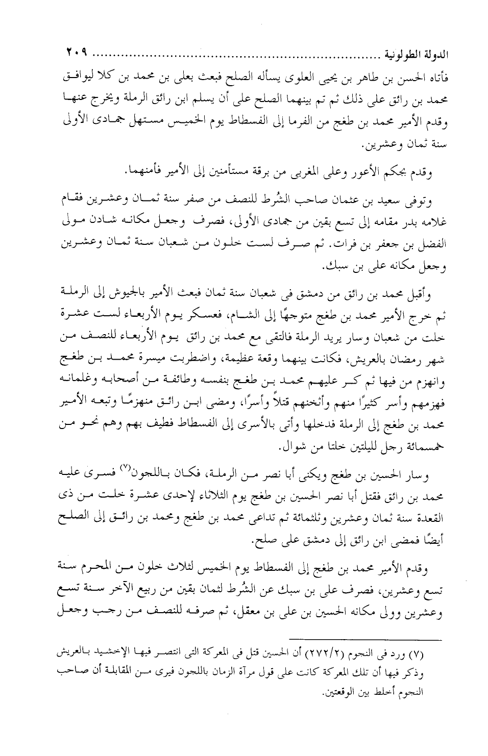 وسار الْحُسَيْن بْن طُغج يُكنى أَبَا نصر من الرَّملة فكان باللَجُّون، فسرى عَلَيْهِ محمد بْن رائق، فقتل أَبَا نصر الْحُسَيْن بْن طُغج يوم الثلاثاء لإحدى عشرة خلت من ذي القعدة سنة ثمانَ وعشرين وثلاثمائة، ثمَّ تداعى محمد بْن طُغْج، ومحمد بْن رائق إلى الصُّلح أيضًا، فمضى ابن رائق إلى دِمَشْق عَلَى صُلح.