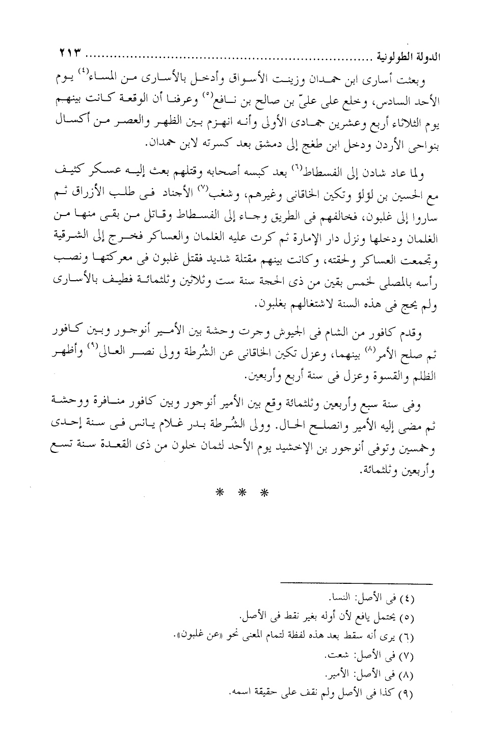 وبُعثت أُسارَى ابن حَمدان، وزُينت الأسواق، وأُدخل بالأُسارَى من المساء يوم الأحد السادس، وخلع عليّ بْن صالح بْن نافع، وعرَّفنا أن الوقعة كانت بينهم يوم الثلاثاء أربع وعشرين جمادى الأولى، وأنه انهزم بين الظُّهر والعَصر من أَكْسال بنواحي الأُردُنّ، ودخل ابن طُغْج إلى دِمَشق بعد كسرته لابن حَمدان.