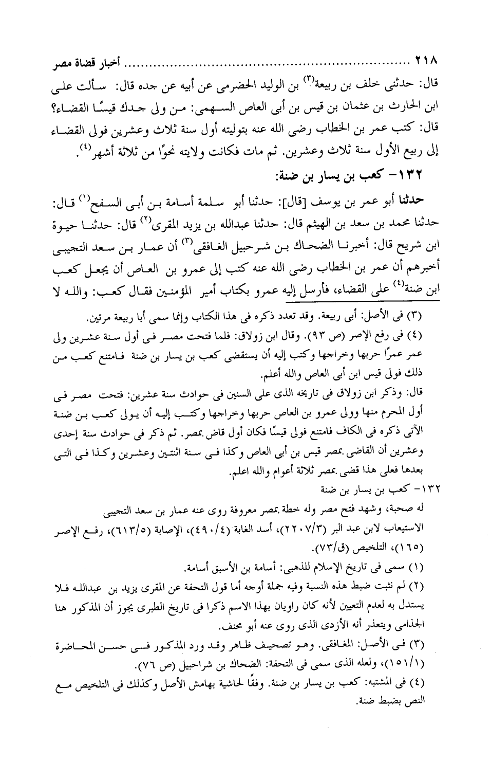 حَدَّثَنَا أَبُو عُمَر بْن يُوسُفَ، قَالَ: حَدَّثَنَا أَبُو سَلَمة أُسامة بْن أَبِي السَّفْحِ، قَالَ: حَدَّثَنَا مُحَمَّدُ بْنُ سَعْدِ بْنِ الْهَيْثَمِ، قَالَ: حَدَّثَنَا عَبْدُ اللَّهِ بْنُ يَزِيدَ الْمُقْرِئُ، قَالَ: حَدَّثَنَا حَيْوَة بْن شُرَيح، قَالَ: أَخْبَرَنَا الضحَّاك بْن شُرَحبِيل الغافِقي، أَنَّ عَمَّارَ بْنَ سَعْدٍ التُّجِيبي، أَخْبَرَهُمْ «أَنَّ عُمَرَ بْنَ الْخَطَّابِ رَضِيَ اللَّهُ عَنْهُ كَتَبَ إِلَى عَمْرِو بْنِ الْعَاصِ أَنْ يَجْعَلَ كَعْبَ بْنَ ضِنَّة عَلَى الْقَضَاءِ» .