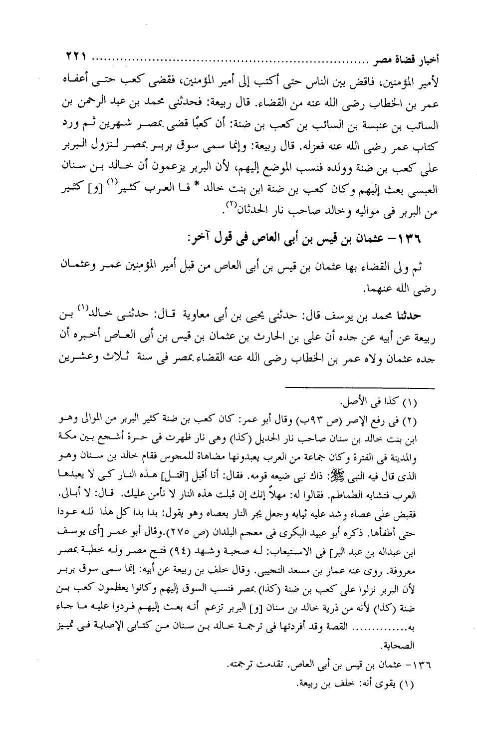 فَقَضَى كَعْبٌ حَتَّى أَعْفَاهُ عُمَرُ بْنُ الْخَطَّاب رَضِيَ اللَّهُ عَنْهُ مِنَ الْقَضَاءِ "، قَالَ رَبِيعَةُ: فَحَدَّثَنِي مُحَمَّدُ بْنُ عَبْدِ الرَّحْمَنِ بْنِ السَّائِبِ بْنِ عَنْبَسَةَ بْنِ السَّائِبِ بْنِ كَعْبِ بْنِ ضِنَّةَ: أَنَّ كَعْبًا قَضَى بِمِصْرَ شَهْرَيْنِ ثُمَّ وَرَدَ كِتَابُ عُمَرَ رَضِيَ اللَّهُ عَنْهُ، فَعَزَلَهُ، قَالَ رَبِيعَةُ: وَإِنَّما سُمِّيَ سُوق بَرْبَر بِمِصْرَ لِنُزُولِ الْبَرْبَرِ عَلَى كَعْب بْن ضِنَّة وَوَلَدِهِ، فَنُسِبَ الْمَوْضِعُ إِلَيْهِمْ لأَنَّ الْبَرْبَرَ يَزْعُمُون أنَّ خَالِد بْنَ سِنان العَبْسيّ بُعِث إِلَيْهِمْ، وَكَانَ كَعْبَ بْن ضِنَّة بْن بِنْت خَالِد، فَمَا الْعَرَب. . . . . . . . وَكَثِير مِنَ البَرْبَر فِي مَوَالِيهِ، وَخَالِدٌ صَاحِبُ نَارِ الْحَدَثانِ