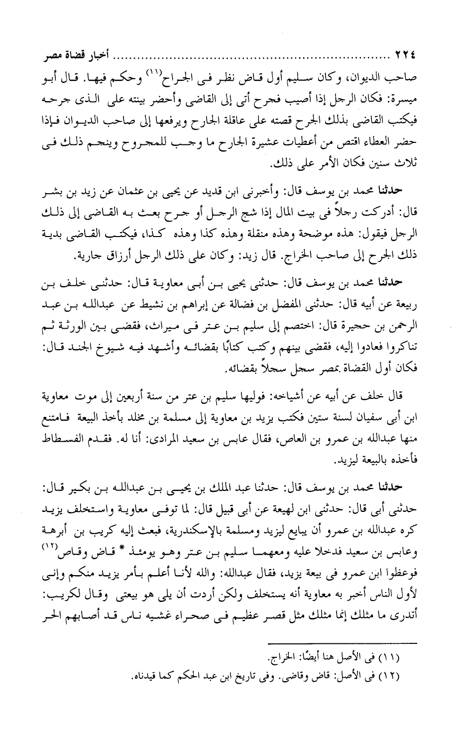 حَدَّثَنَا محمد بْن يوسف، قَالَ: حَدَّثَنِي يحيى بْن أَبِي مُعاوية، قَالَ: حَدَّثَنِي خلَف بْن رَبيعة، عَنْ أبيه، قَالَ: حَدَّثَنِي المُفضَّل بْن فَضالة، عَنْ إبراهيم بْن نَشيط، عَنْ عبد الله بْن عبد الرحمن بْن حُجَيرة، قَالَ: " اختُصِم إلى سُلَيم بْن عِتْر فِي مِيراث، فقضى بين الورَثة ثمَّ تناكروا، فعادوا إِلَيْهِ، فقضى بينهم وكتب كتابًا بقضائه، وأشهد فِيهِ شيُوخ الجُند، قَالَ: فكان أوَّل القُضاة بِمصر سجّل سِجِلًّا بقَضائه ".