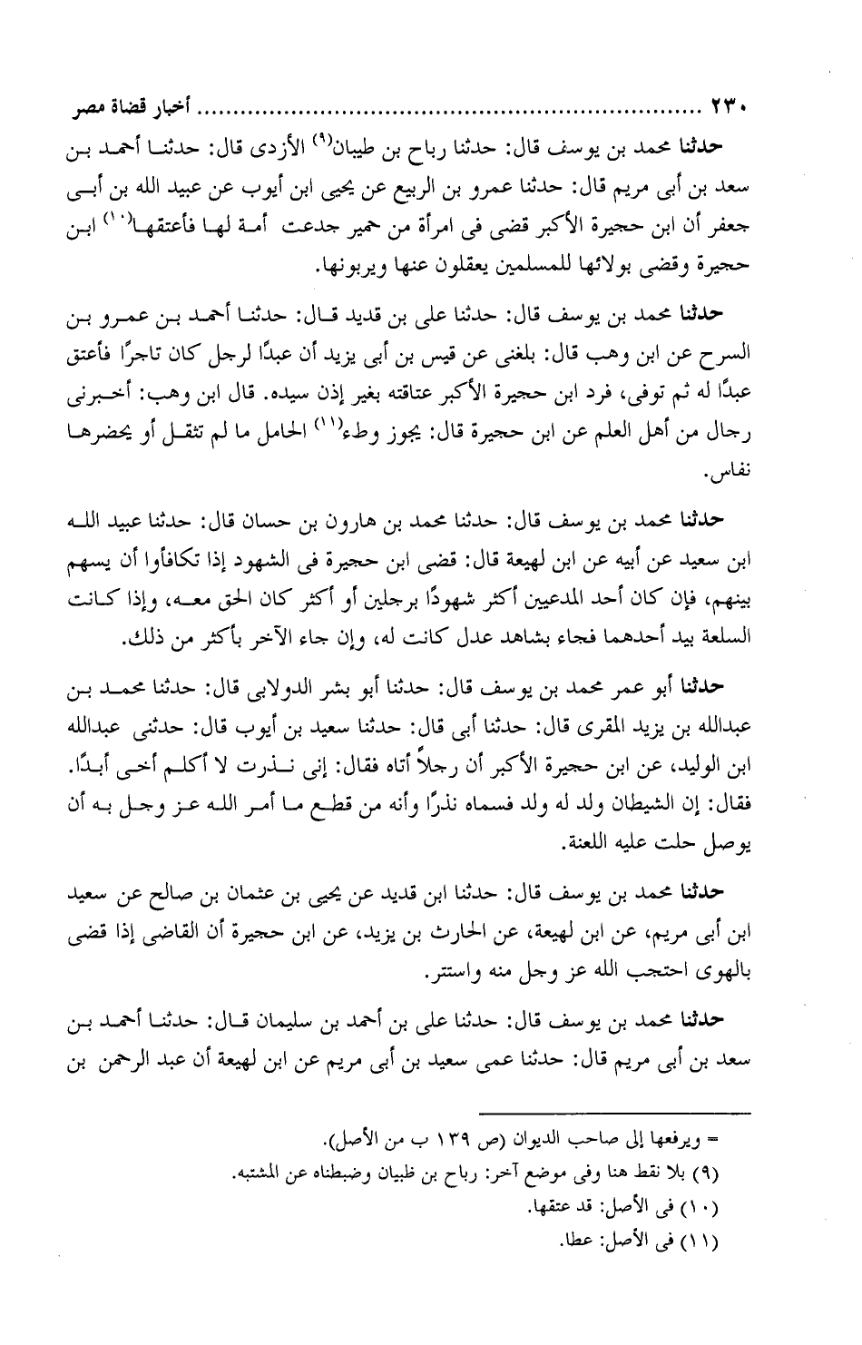 حدثنا محمد بن يوسف، قَالَ: حَدَّثَنَا محمد بْن هارون بْن حسَّان، قَالَ: حَدَّثَنَا عُبَيْد اللَّه بْن سَعِيد، عَنْ أبيه، عَن ابن لَهِيعة، قَالَ: قضى ابن حُجَيرة فِي الشُّهود إذا تكافئُوا أن يُسهَم، فإِن كَانَ أحد المدّعيَّيْن أكثر شهُودًا برجُلَين أو أكثر كَانَ الحقّ معه، وإذا كانت السِّلْعة بيد أحدهما، فجاء بشاهد عَدْل كَانَ لَهُ، وإن جاء الآخر بأكثر من ذَلكَ "