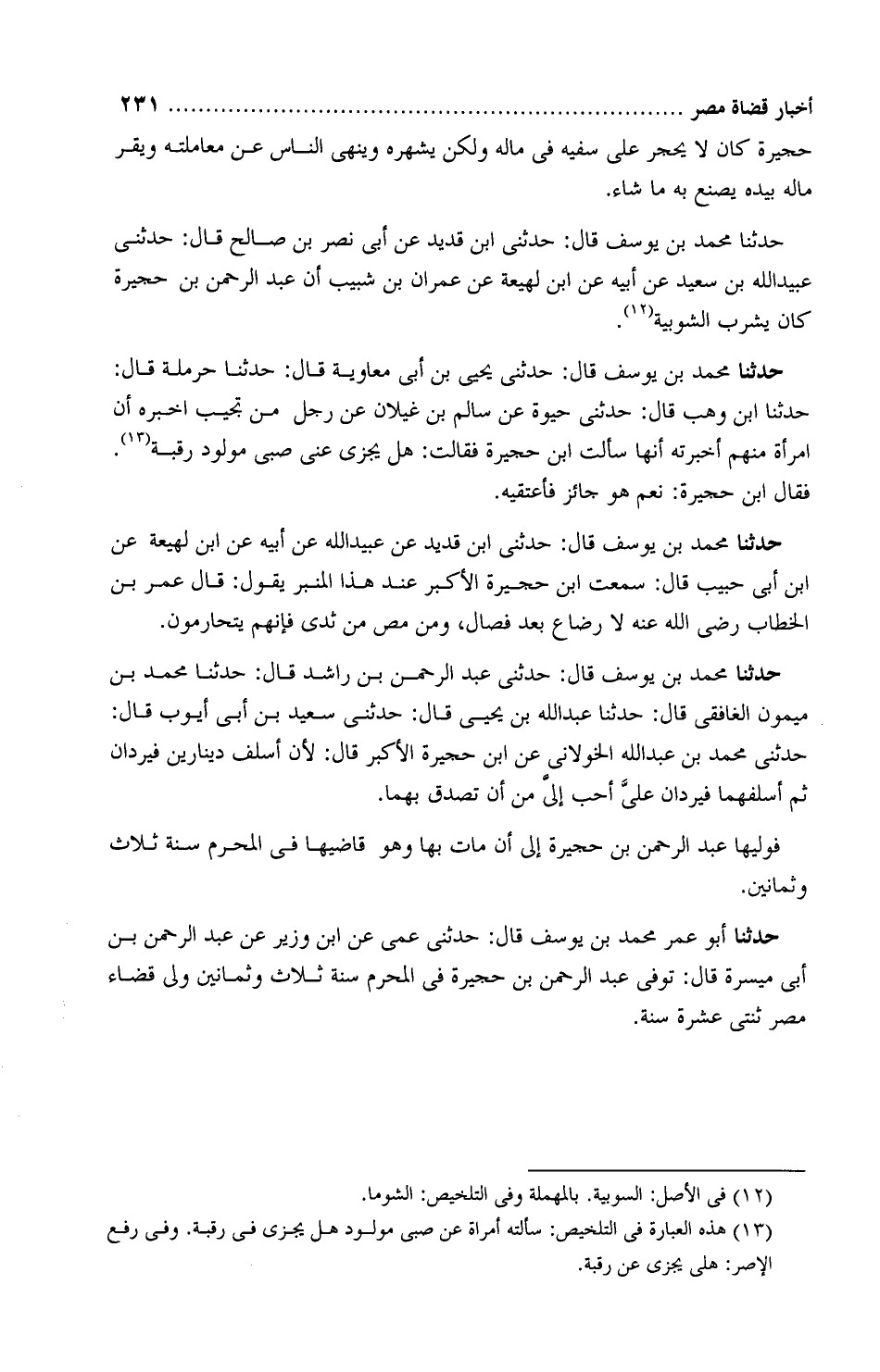 حَدَّثَنَا أَبُو عُمَر محمد بْن يوسف، قَالَ: حَدَّثَنِي عمّي، عَن ابن وزير، عَنْ عبد الرحمن بْن أَبِي مَيْسَرة، قَالَ: «تُوُفّي عبد الرحمن بْن حُجَيرة فِي المحرَّم سنة ثلاث وثمانين ولِيَ قضاء مِصر ثنتي عشرة سنة»