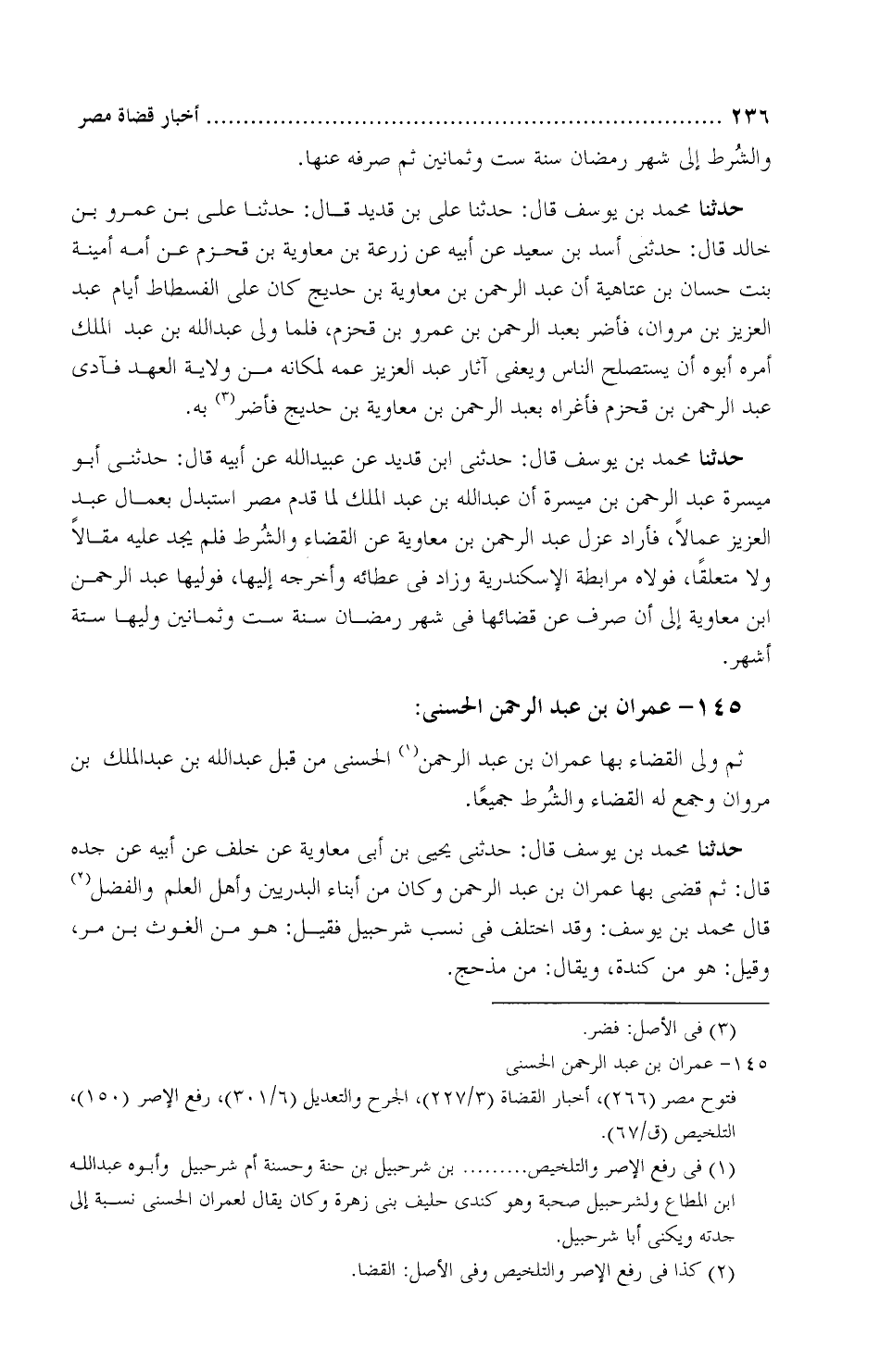 حَدَّثَنَا محمد بْن يوسف، قَالَ: حَدَّثَنِي يحيى بْن أَبِي مُعاوية، عَنْ خلَف، عَنْ أبيه، عَنْ جَدّه، قَالَ: «ثمَّ قضى بها عِمران بْن عبد الرحمن وكان من أبناء البدريّين، وأهل العلم والفضل» ، قَالَ محمد بْن يوسف: وقد اختُلِف فِي نسَب شُرَحبِيل، فقيل: هُوَ من الغَوْث بْن مُرّ.