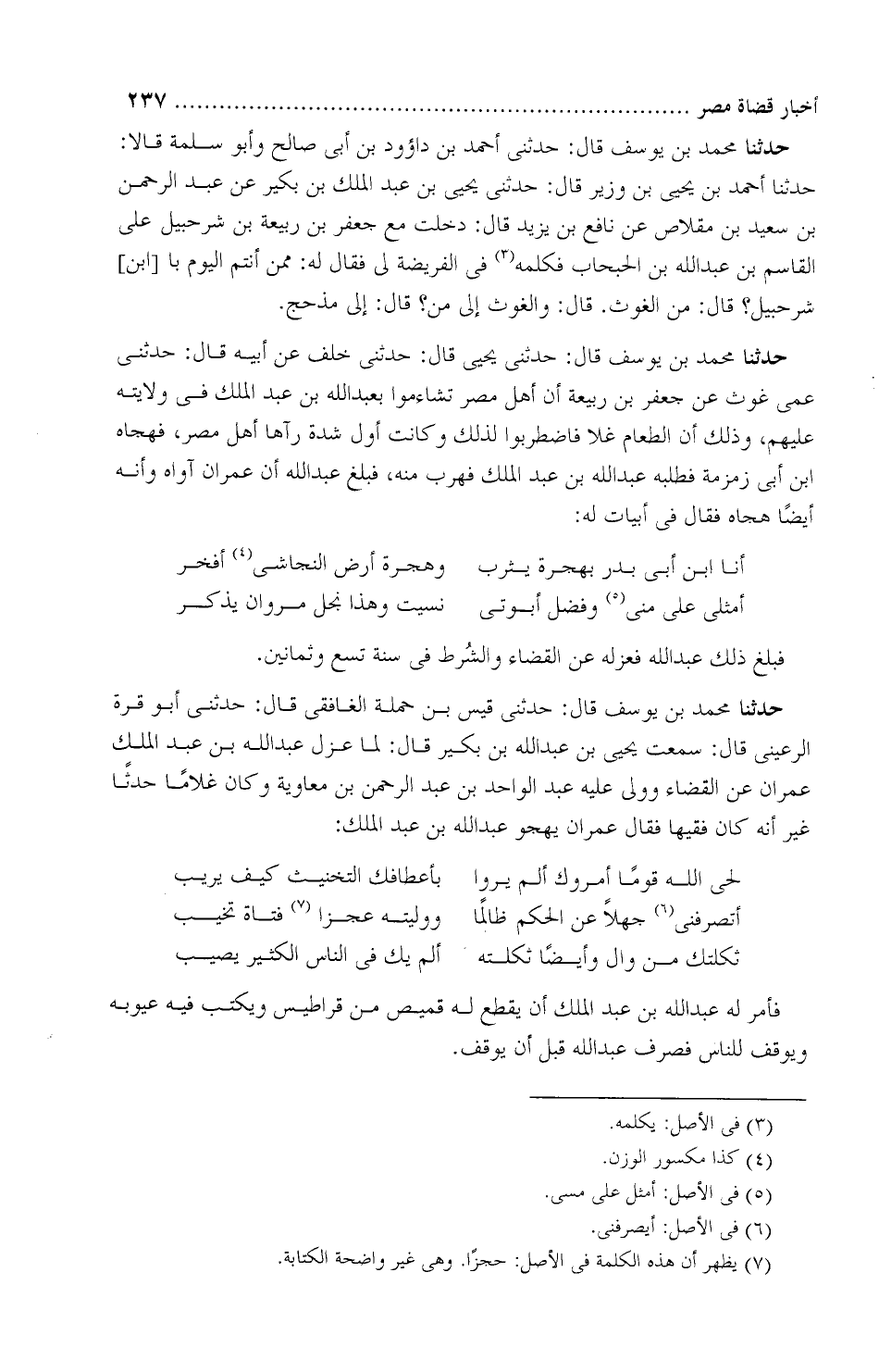 حَدَّثَنَا محمد بْن يوسف، قَالَ: حَدَّثَنِي قيس بْن حَمَلة الغافقيّ، قَالَ: حَدَّثَنِي أَبُو قُرَّة الرُّعَينيّ، قَالَ: سَمِعْتُ يحيي بْن عبد الله بْن بُكَير، قَالَ: " لمَّا عزل عبد الله بْن عَبْد الملك عِمرانَ عَن القضاء، وولَّى عَلَيْهِ عَبْد الواحد بْن عبد الرحمن بْن مُعاوية، وكان غُلامًا، حَدَثًا غير أنَّه كَانَ فقيهًا، فقال عِمران يهجو عبد الله بْن عَبْد الملك:
