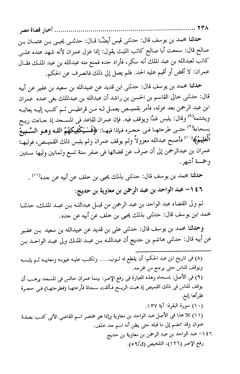 وحَدَّثَنَا محمد بْن يوسف، قَالَ: حَدَّثَنِي عليّ بْن قُدَيد، عَنْ عُبَيْد اللَّه بن سَعِيد بْن عُفَير، عَنْ أبيه، قَالَ: حَدَّثَنِي هاشم بْن حُدَيج، «أن عبد الله بْن عَبْد الملك ولَّى عَبْد الواحد بْن