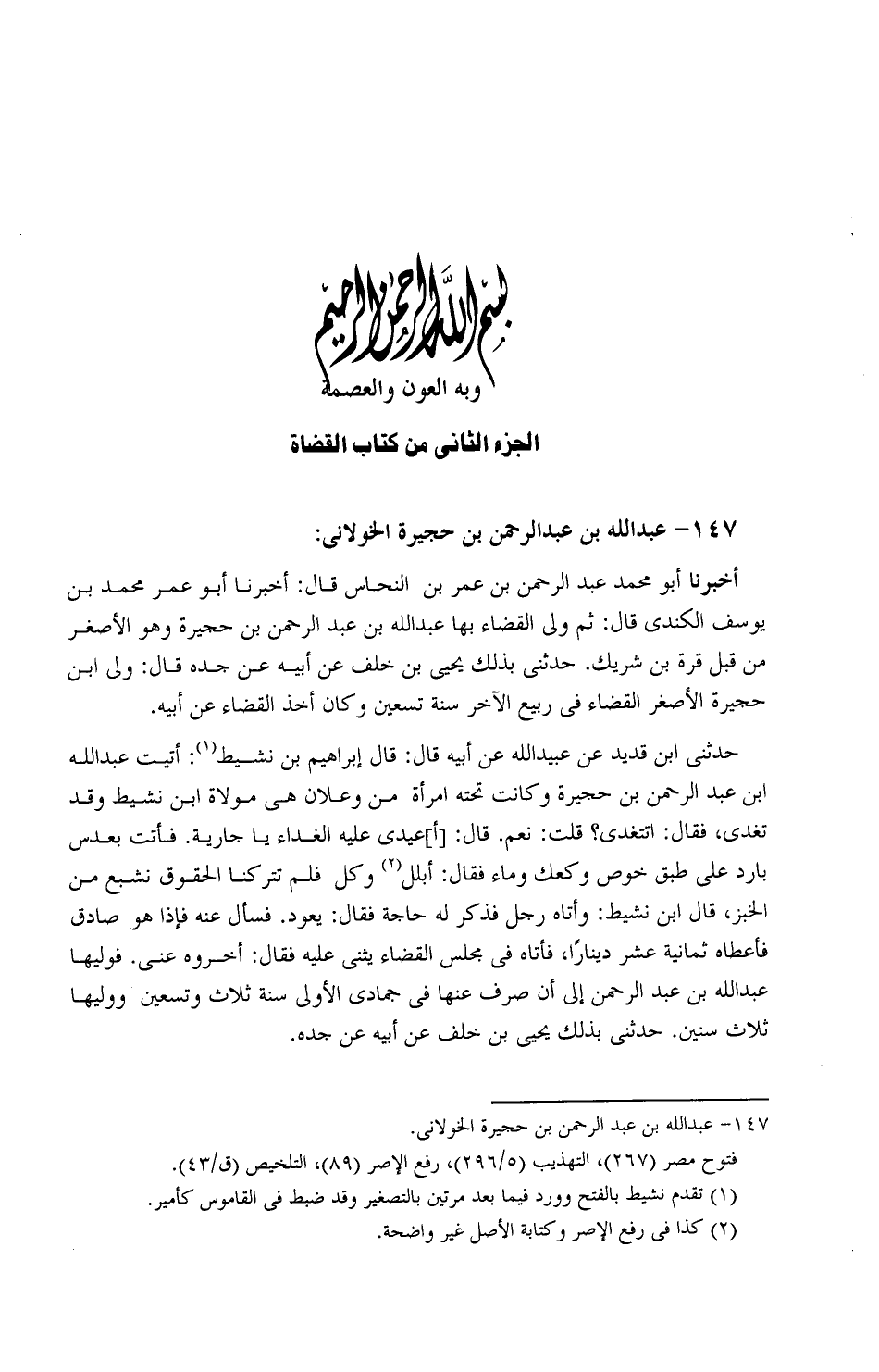 أخبرنا أَبُو محمد عبد الرحمن بْن عُمَر بْن النحَّاس، قَالَ: أخبرنا أَبُو عُمَر محمد بْن يوسف الكِنديّ، قَالَ: «ثمَّ ولِيَ القضاء بها عبد الله بن عبد الرحمن بن حجيرة وهو الأصغر من قبل قرة بن شريك»