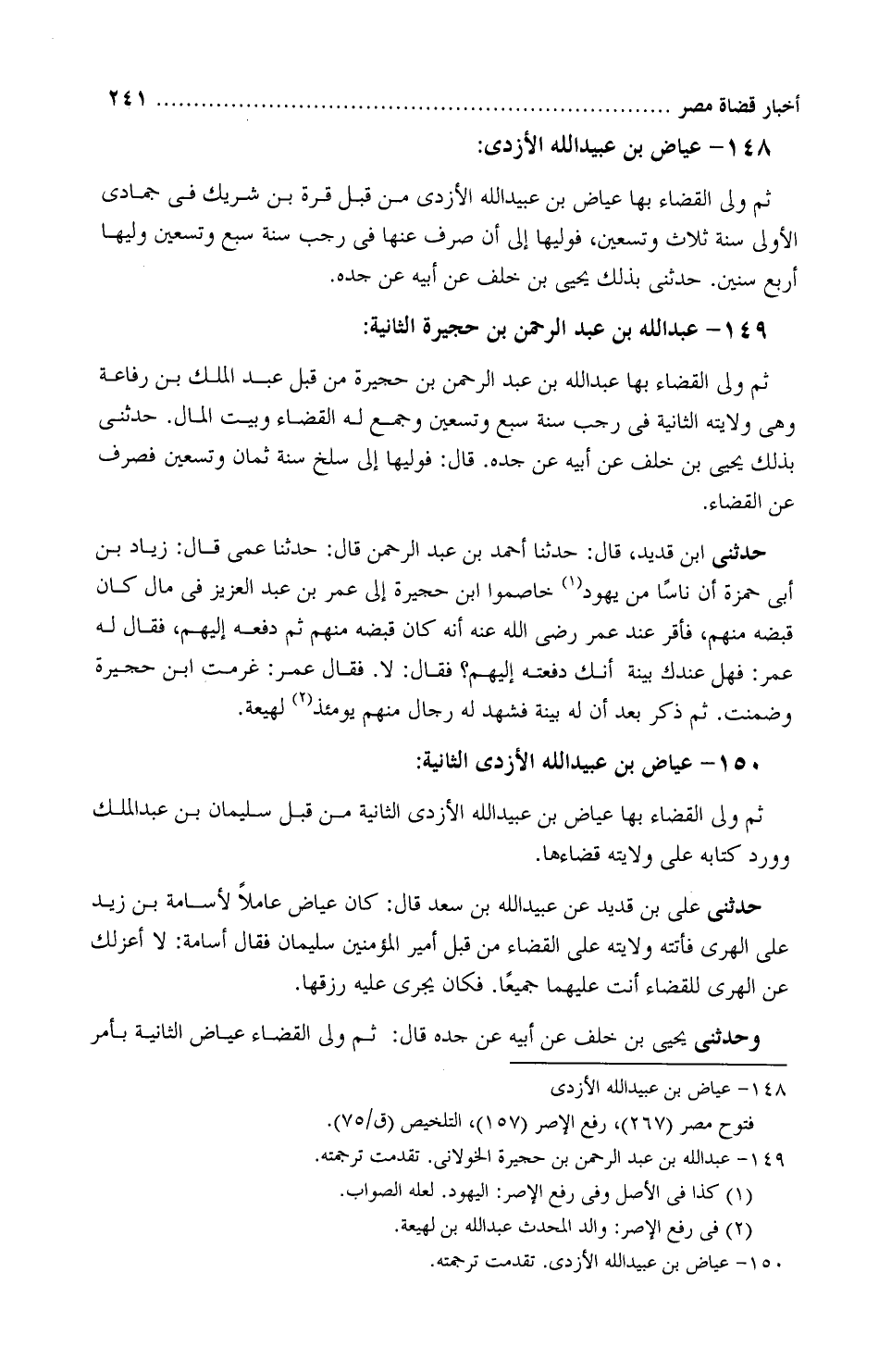 ثمَّ ولِيَ القَضاء بها عِياض بْن عُبَيْد اللَّه الأَزديّ من قِبَل قُرّة بْن شَرِيك فِي جمادى الأولى سنة ثلاث وتسعين، فولِيَها إلى أن صُرف عَنْهَا فِي رجب سنة سبع وتسعين ولِيَها أربع سنين.