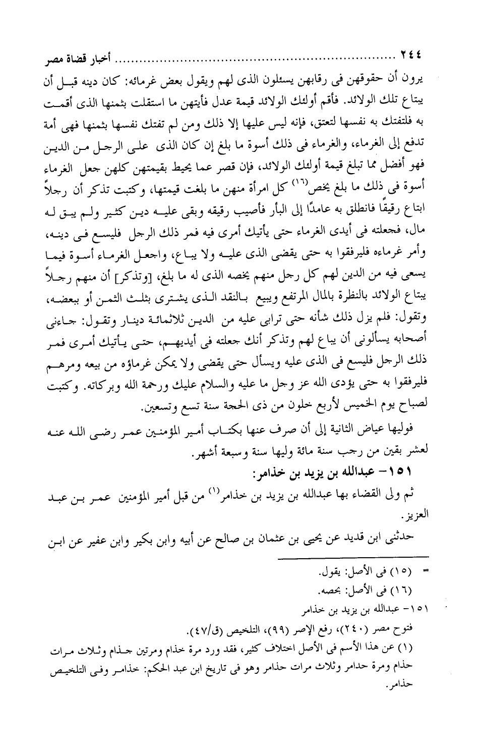 فأَقم أولئك الولائد قيمةَ عدل، فأيّتهنَّ ما استقلَّت بثمَنها الَّذِي أقمتَ بِهِ، فلتفتكّ بِهِ نفسها لِتُعْتَقَ، فإنه لَيْسَ علهيا إلَّا ذَلكَ، ومن لم تفتكّ نفسها بثمنها، فهي أمة تُدفع إلى الغُرَماء والغُرَماء فِي ذَلكَ أُسوةُ ما بلغ إن كَانَ الَّذِي عَلَى الرجُل من الدَّين، فهو أفضل ممَّا تبلغ قيمة أُولئك الولائد، فإن قصُر عمَّا يُحيط بقيمتهنَّ كلّهنّ، جُعل الغُرماء أسوةً فِي ذَلكَ ما بلغ يخص كلّ امرأَة منهن ما بلغت قيمتها، وكتبتَ تذكر أن رجُلًا ابتاع رقيقًا، فانطلق بِهِ عامدًا إلى البأْر، فأُصيب رفيقه عَلَيْهِ دَين كثير، ولم يبقَ، لَهُ مال، فجعلته فِي أيدي الغُرَماء حتى يأتيك أمري فِيهِ، فمُر ذَلكَ الرجُل، فليسعَ فِي دَينة وأْمُرْ غُرَماءه، فليرفُقوا بِهِ حتى يقضي الَّذِي عَلَيْهِ ولا يُباع، واجعَل الغُرماء أُسوةً فيما يسعى فِي من الدَّين لهم، كلّ رجُل منهم يخُصّه الَّذِي لَهُ ما بلغ، وتذكر أن منهم رجلًا يبتاع الولائد بالنَّظِرة بالمال المرتفع، ويبيع بالنقد الَّذِي يشتري بثُلُث الثمن أو ببعضه، وتقول: فلم يزَلْ ذَلكَ شأْنه حتَّى ترابى عَلَيْهِ من الدين ثلاثمائة دينار.