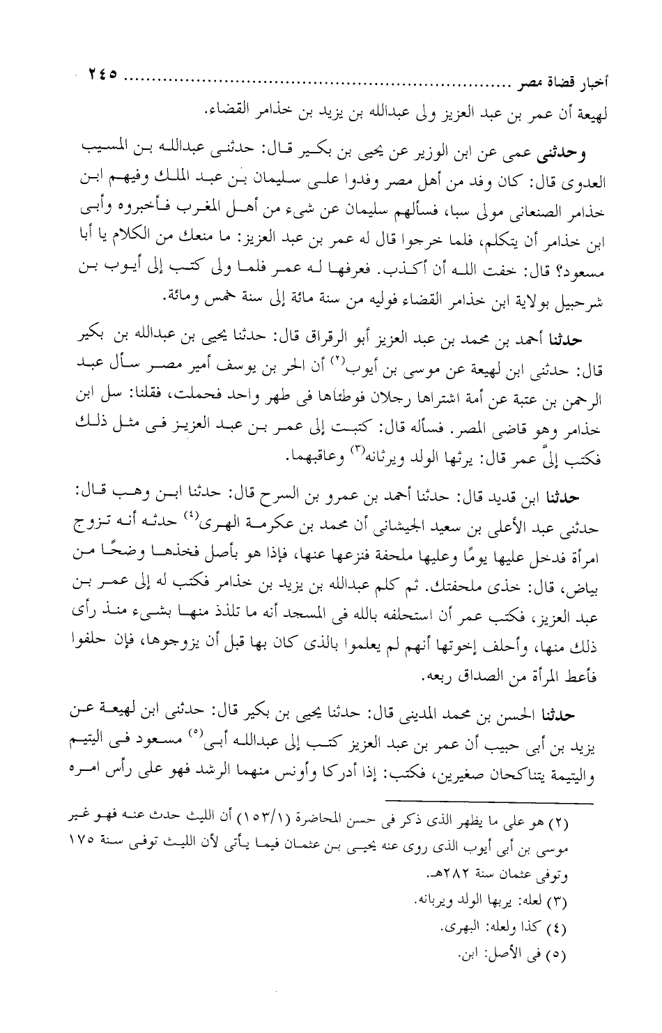 حَدَّثَنَا أحمد بْن محمد بْن عَبْد العزيز أَبُو الرَّقراق، قَالَ: حَدَّثَنَا يحيى بْن عبد الله بْن بُكَير، قَالَ: حَدَّثَنِي ابن لَهِيعة، عَنْ مُوسَى بْن أيُّوب، أن الحُرّ بن يوسف أمير مِصر سأَل عبد الرحمن بْن عُتبة، " عَنْ أَمة اشتراها رجُلان، فوطآها فِي طُهْر واحد، فحملت، فقلنا: سلِ ابن خُذامر وهو قاضي المِصر.