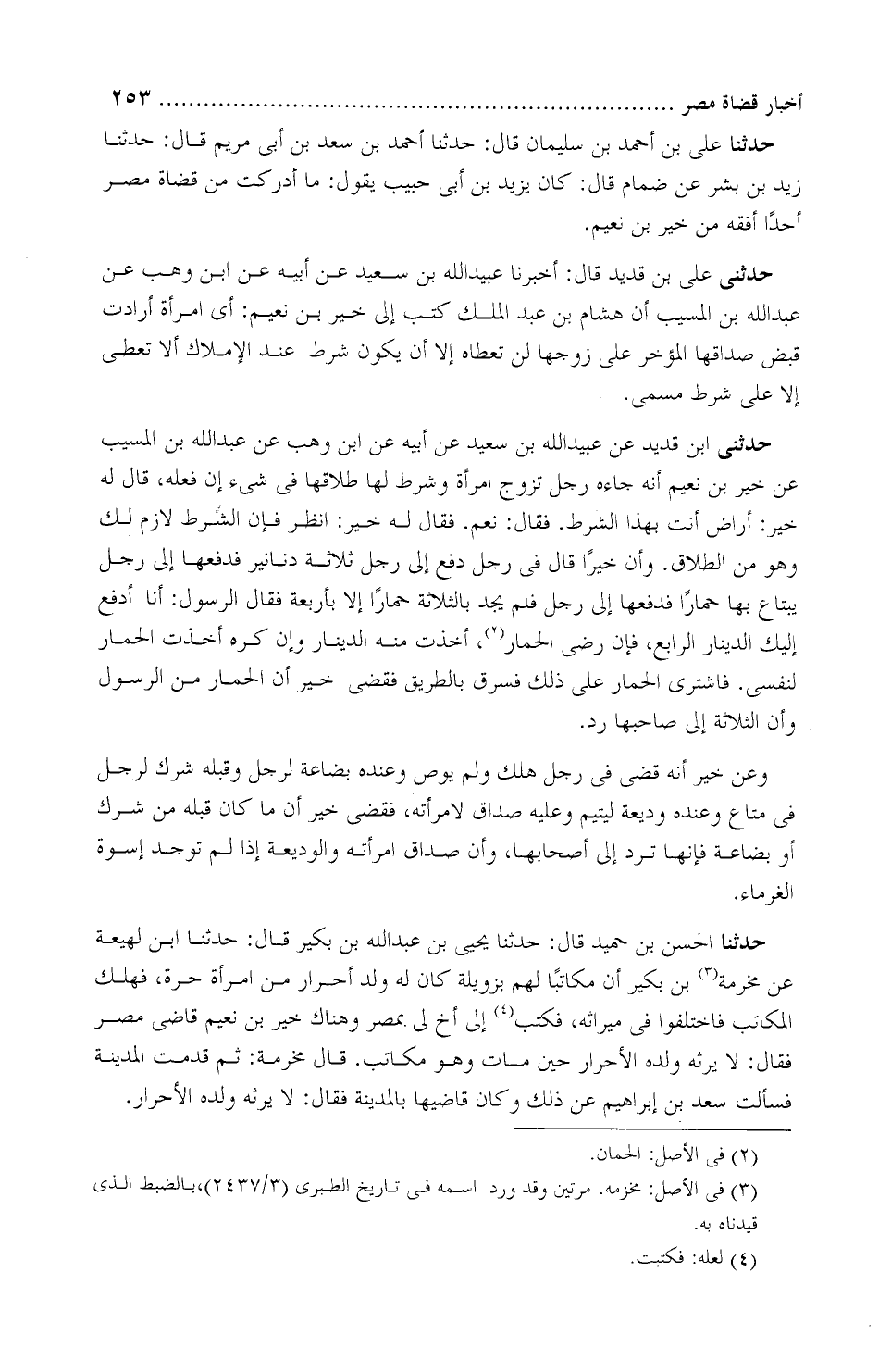 حَدَّثَنَا عليّ بْن أحمد بْن سُلَيْمَان، قَالَ: حَدَّثَنَا أحمد بْن سعد بْن أَبِي مَرْيَم، قَالَ: حَدَّثَنَا زيد بْن بِشر، عَنْ ضِمام، قَالَ: كَانَ يزيد بْن أَبِي حَبيب، يَقُولُ: «ما أدركت من قُضاة مِصر أحدًا أفقه من خَيْر بْن نُعَيم»