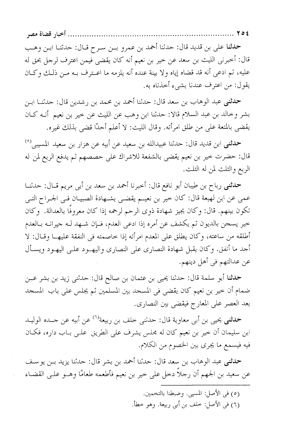 حَدَّثَنِي عَبْد الوهَّاب بْن سَعِيد، قَالَ: حَدَّثَنَا أحمد بْن محمد بْن رِشْدين، قَالَ: حَدَّثَنَا ابن بِشْر، وخالد بْن عَبْد السلام، قالا: حَدَّثَنَا ابن وَهب، عَن الليث، عَنْ خَيْر بْن نُعَيم، أَنَّهُ «كَانَ يقضي بالمُتْعة عَلَى من طلَّق امرأَته» .
